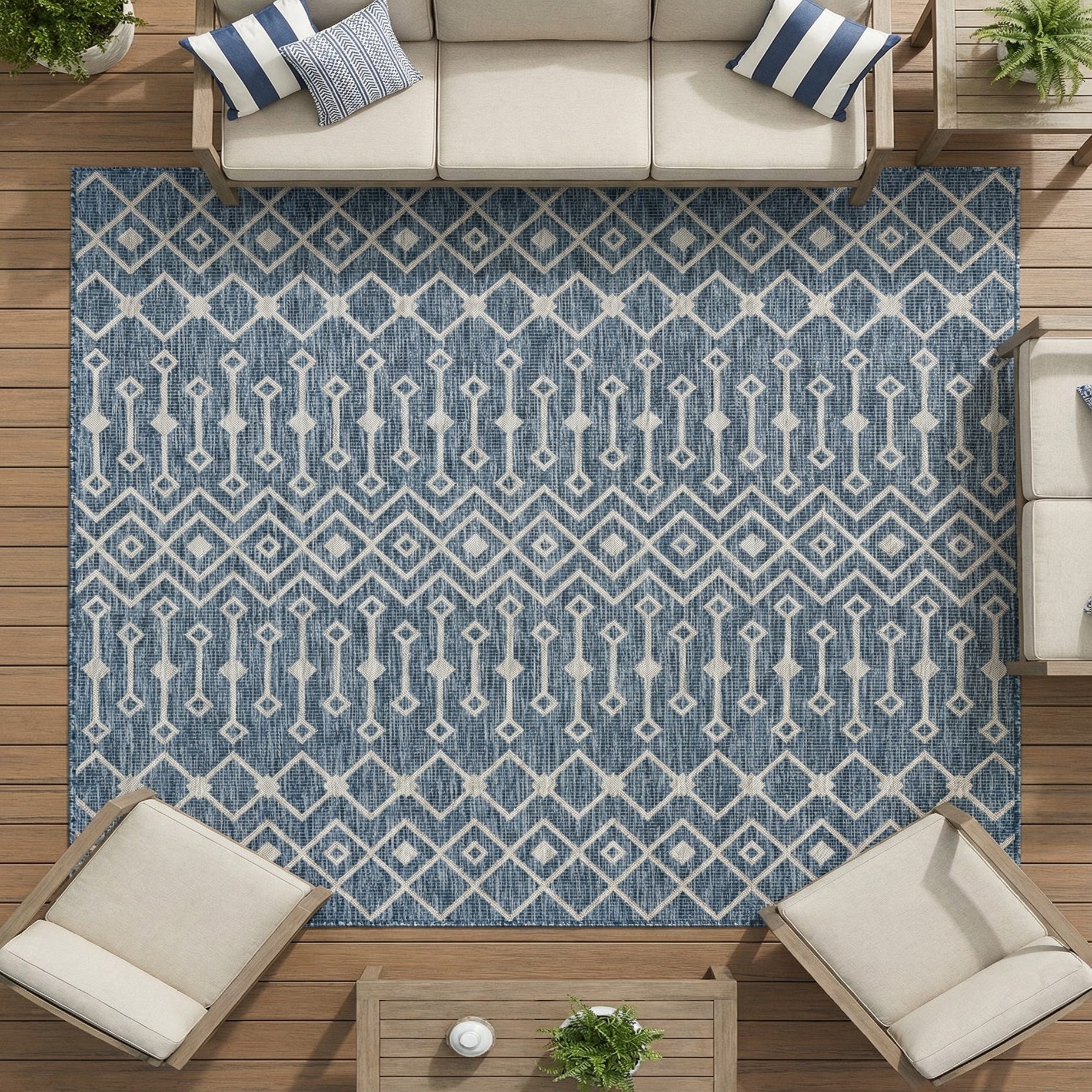 This rug fits naturally into covered outdoor living areas, sunrooms, or a casual dining space where a durable, tailored look is desired. Pair it with weathered teak or gray wicker furniture, navy or white cushions, and metallic or rattan accents for a coastal-modern setting, or use it to anchor a contemporary entryway or mudroom with clean-lined furniture and soft linens.