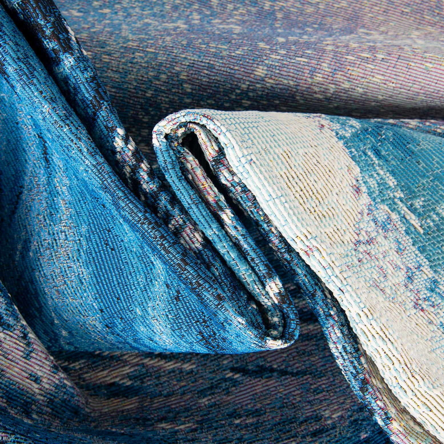 This Outdoor Modern Collection rug brings a dynamic visual impact to any outdoor space with its rich blue hues and abstract wave pattern that gracefully blends ivories, purples, and navy blues. The primary blue background sets a serene tone, evoking the calming essence of ocean waves, making it an ideal choice for areas where relaxation is key.