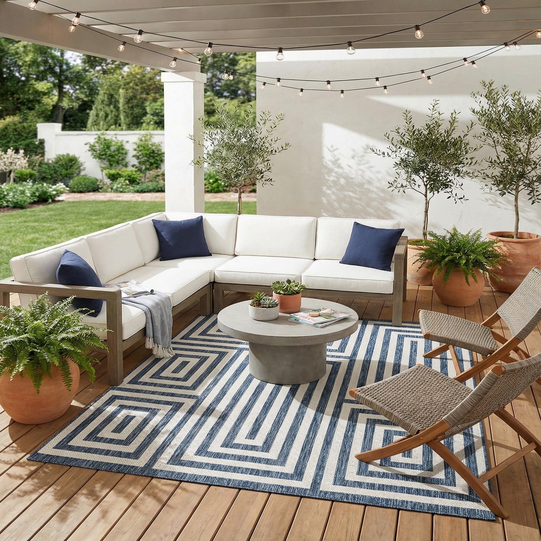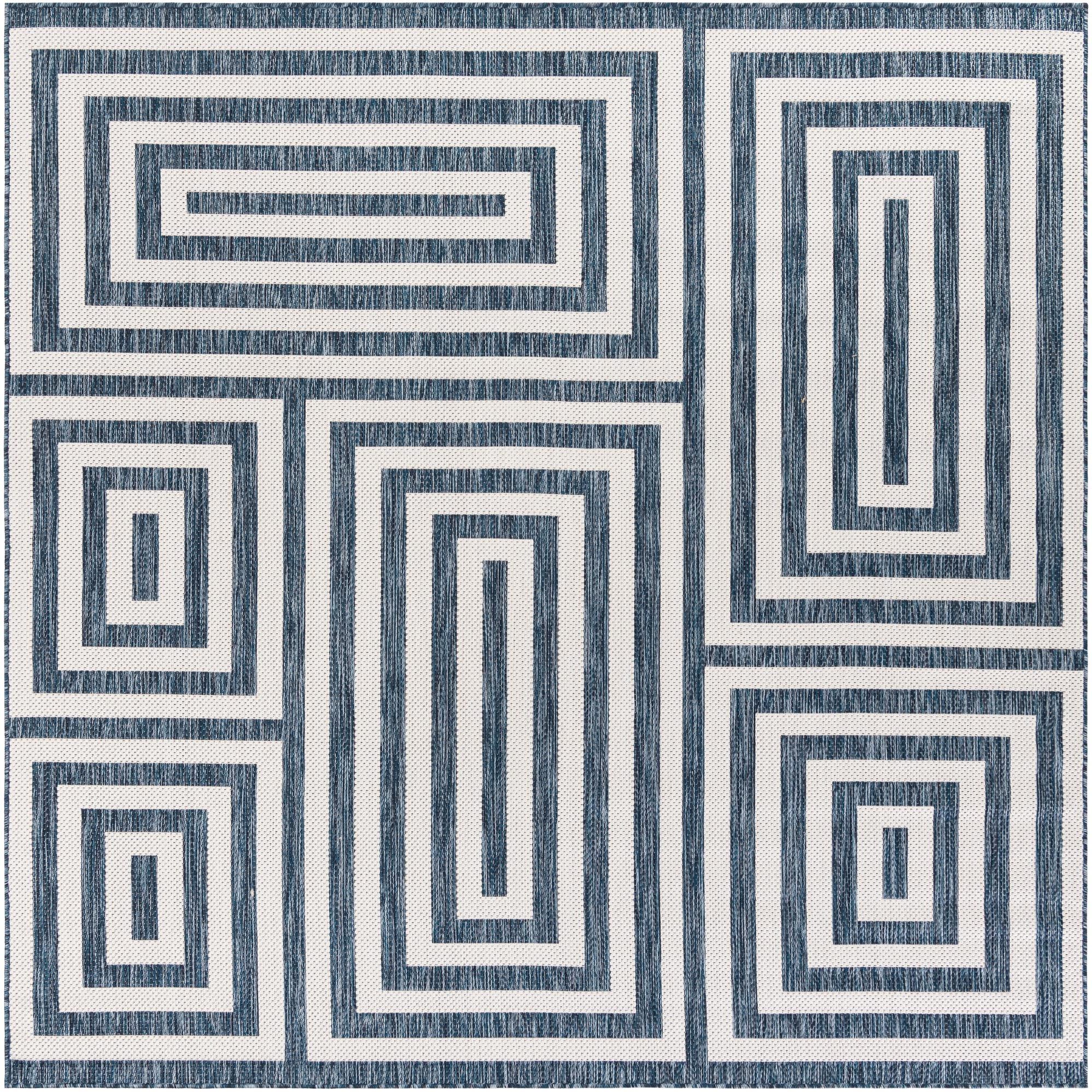 A 7'10 x 7'10 square blue and white modern abstract rug with a geometric maze-like pattern, suitable for indoor or outdoor use.