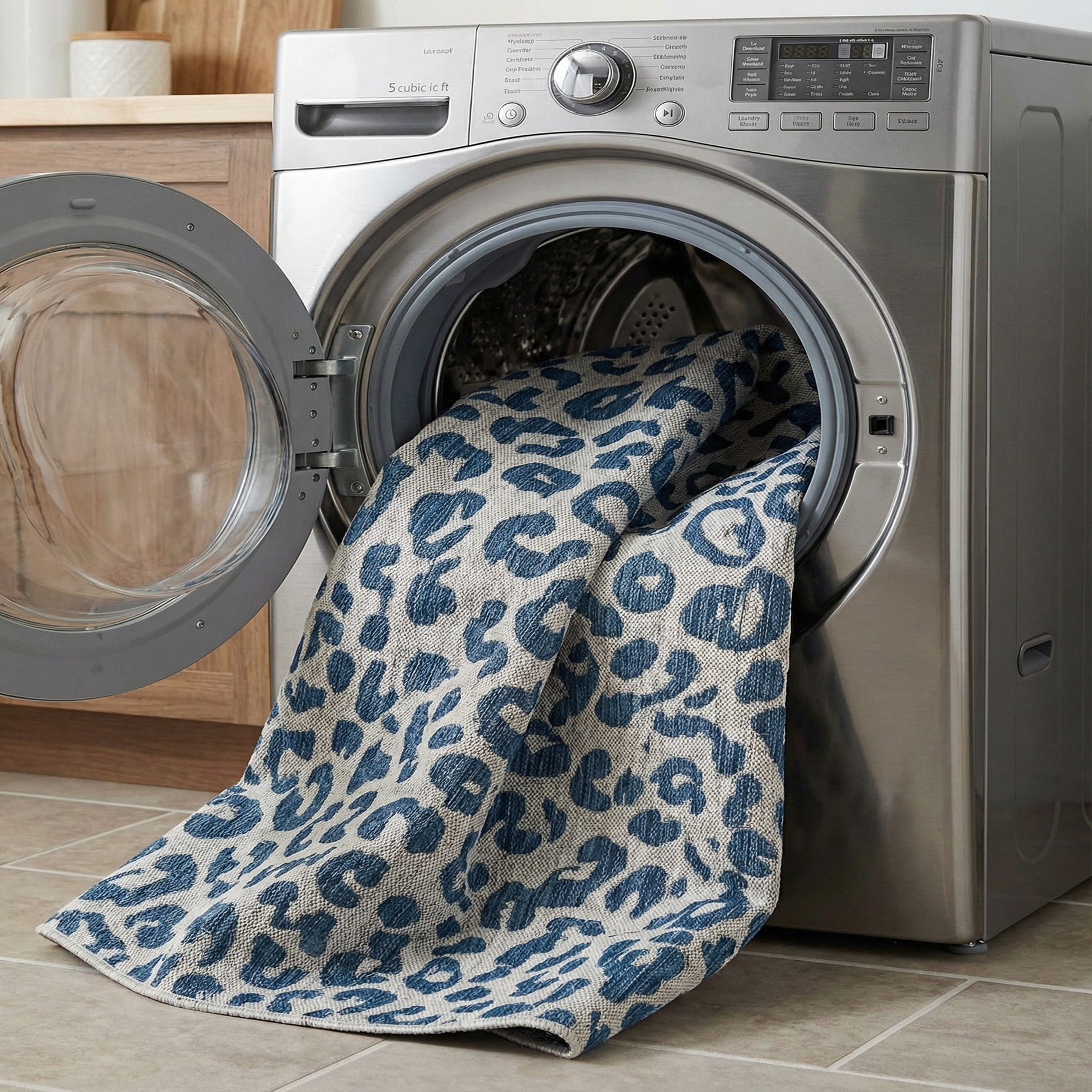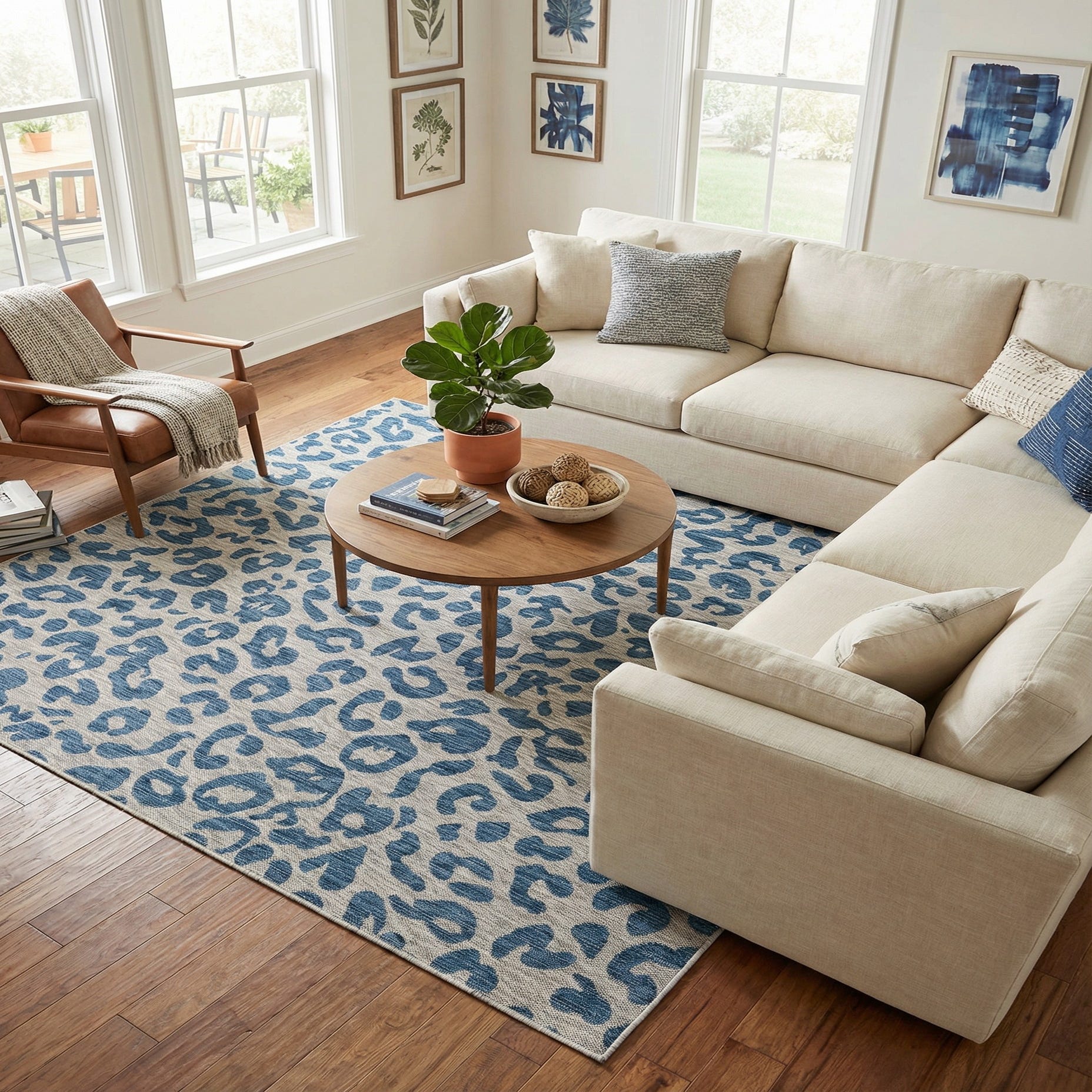 A 7' 10 x 7' 10 square blue and white modern leopard print rug, suitable for indoor or outdoor use.