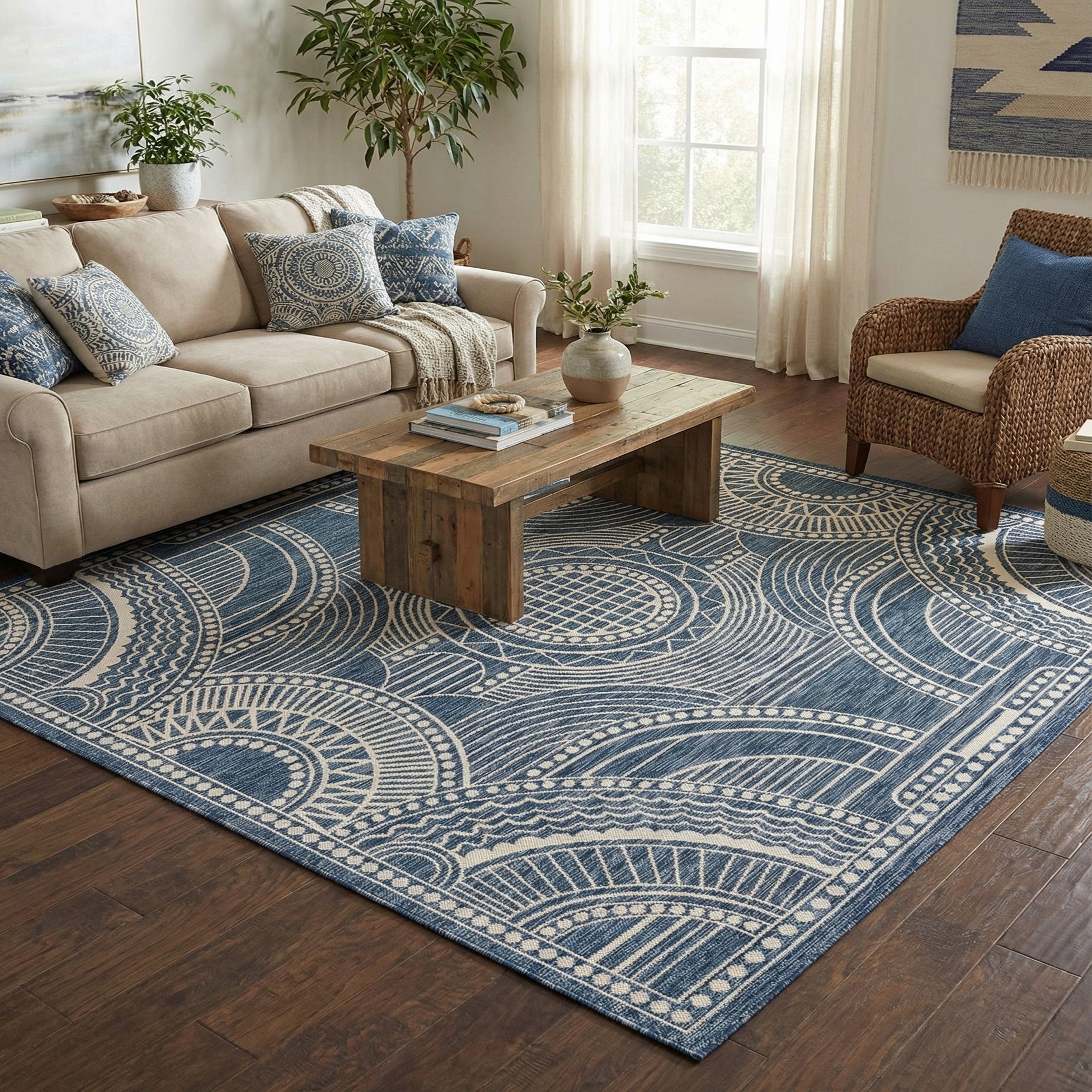 Machine-made from 100% polypropylene, this rug is built for everyday placement—think covered patios, sunrooms, entryways, or a casual dining area where you want graphic interest and easy layering. Pair it with natural wicker or painted wood furniture and soft linen cushions for a coastal-meets-modern look, or place it under a round table in a breezy breakfast nook to anchor the space while keeping the palette light and fresh. The blue-and-ivory combination works equally well with navy upholstery, white trim, and warm-toned accessories.