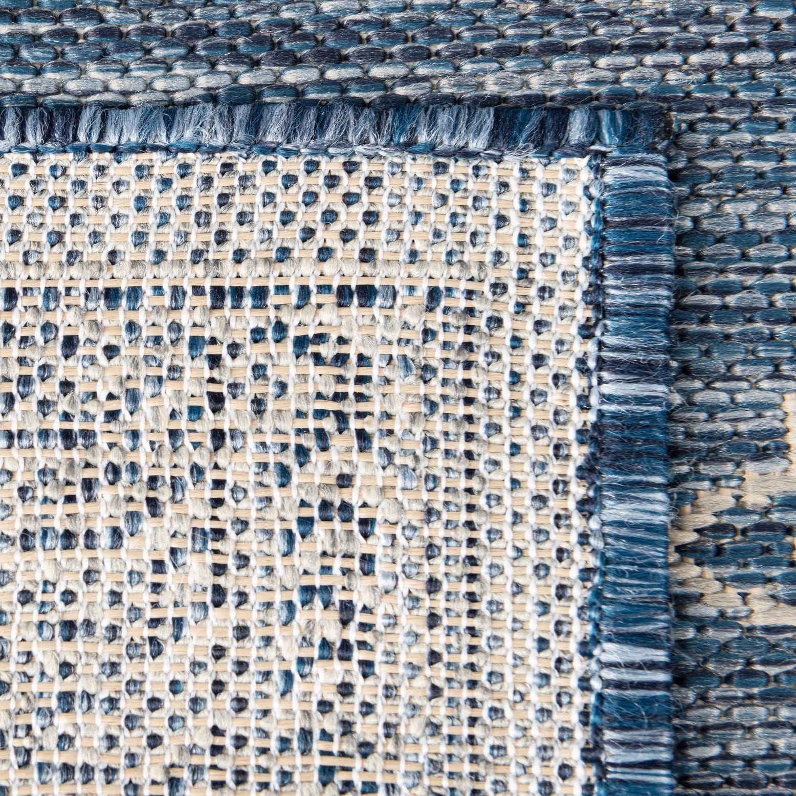 Machine-made of 100% polypropylene, the rug has a low, even pile that feels slightly textured and smooth when you run your hand across it. It lays flat beneath furniture and works well in active spaces—use it to anchor a covered patio dining set, define a seating area on a sunroom or porch, or bring a coastal-traditional touch to a casual living room. Pair it with natural wood or rattan furniture, linen upholstery, and ivory or brass accents for a relaxed, layered look.