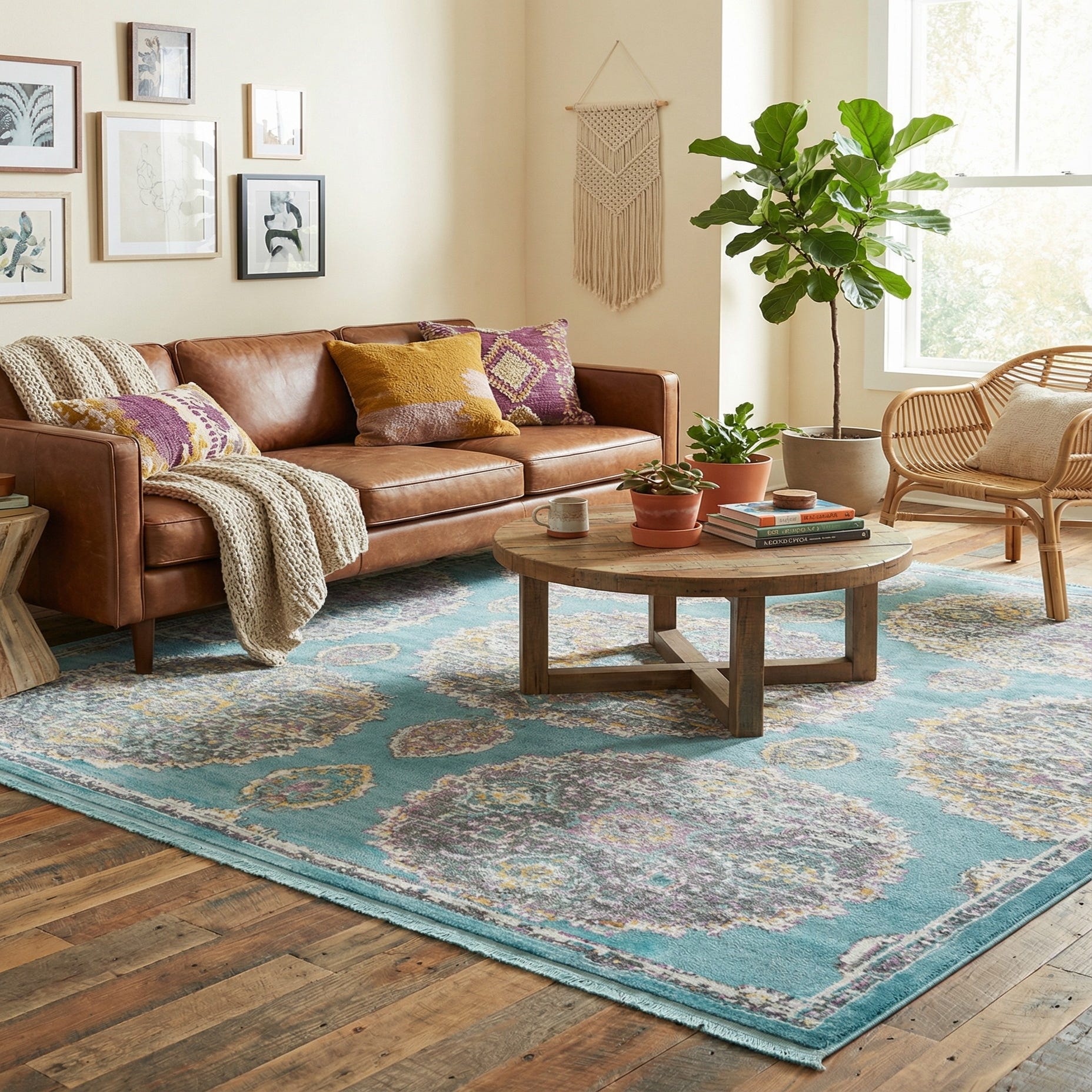 Primary color is Blue. Colors in this rug include: Blue, Gray, Green, Ivory, Purple, Yellow.