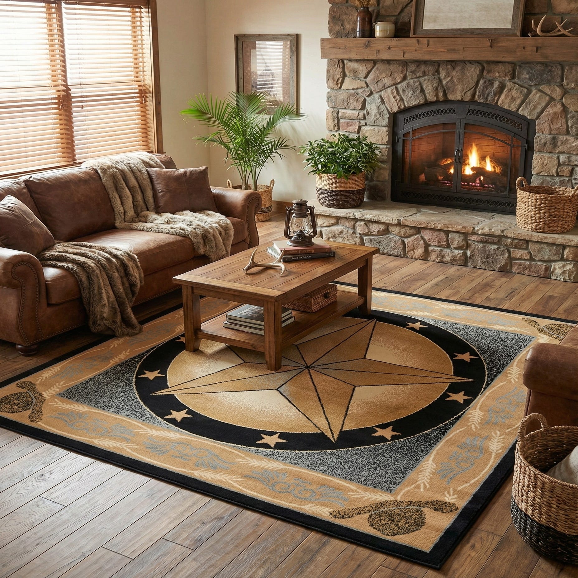 This rug pairs naturally with rustic and western-inspired interiors — think leather sofas, reclaimed-wood tables, or denim and linen upholstery — and it also brings character to casual living spaces, entryways, or a covered porch. Use it to anchor a conversation area in a family room, to add themed interest in a cabin or lodge-style setting, or to ground a relaxed dining area with warm neutral furnishings and simple metal or wood accents.