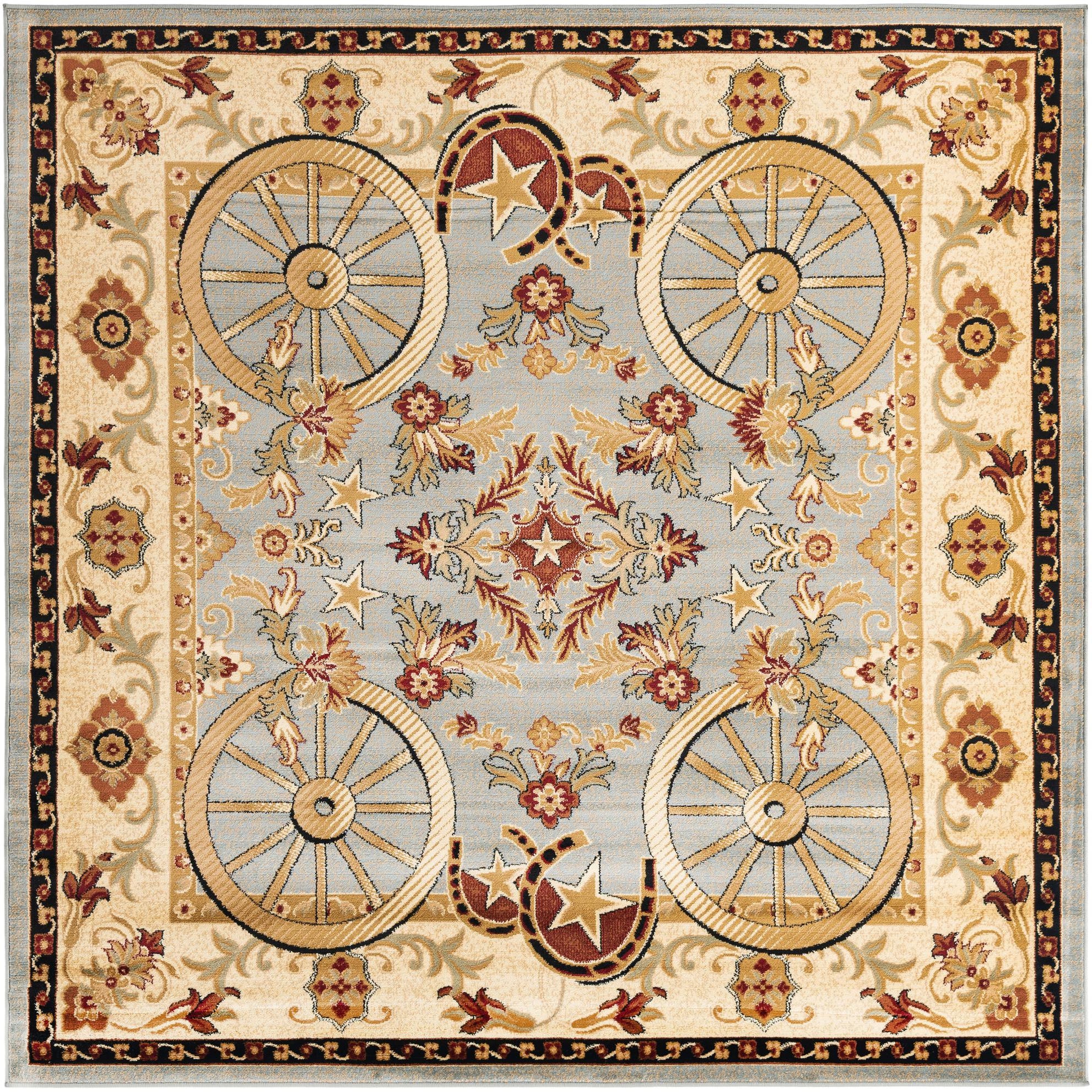 A square blue rustic rug featuring a central medallion with stars, surrounded by four wagon wheels and horseshoes, all framed by a floral border.