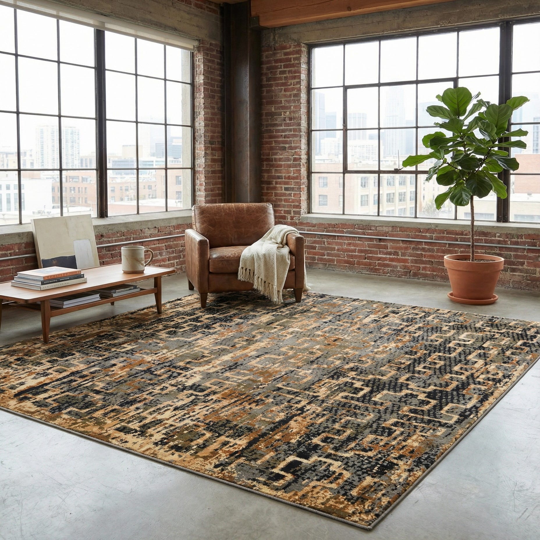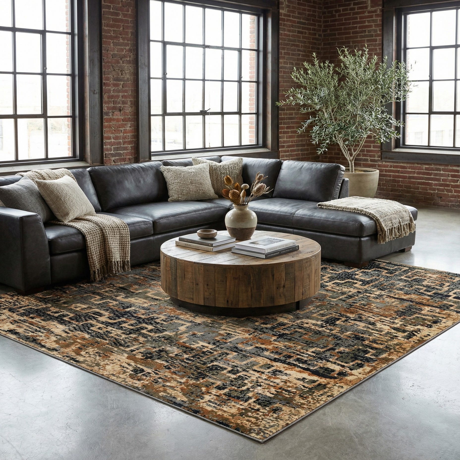 Machine-made from 100% polypropylene, the surface has a low, dense pile that feels smooth and supportive underfoot. The patterned, slightly distressed finish helps disguise everyday wear, making this rug well suited to busy rooms. It can anchor a living room seating arrangement, add pattern beneath a dining table, or define a home office or reading nook. Pair it with mid-century modern furnishings and warm wood tones for a cohesive look, or use it to introduce color and texture into a neutral, minimalist space.
