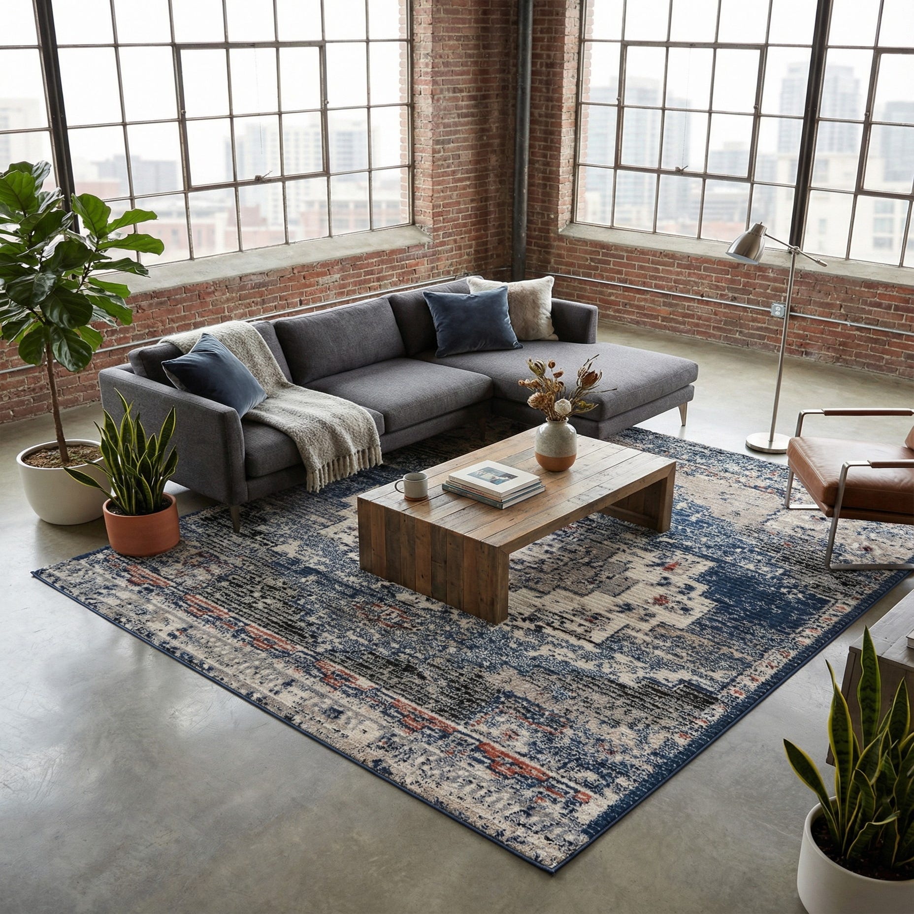 This rug works well as an anchor in a living room beneath a sofa and coffee table, or centered under a dining table to add visual interest without overpowering the space. It pairs nicely with navy or gray upholstery, warm wood tones, and mixed-metal accents, and fits décor schemes ranging from transitional and coastal to modern farmhouse or updated traditional interiors.