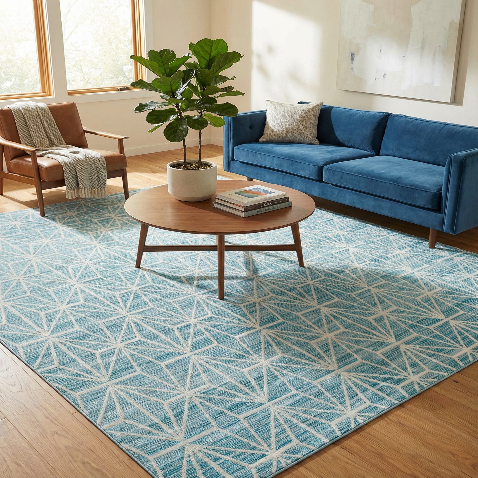 The Uptown Collection offers a modern touch with its 8 Ft Square rug, which showcases a dynamic geometric pattern composed of ivory lines that create a series of interconnected diamonds across a blue background. This contemporary design will infuse any room with a sense of movement and vitality. The rug's machine-woven construction promises durability, combining 70% polypropylene and 30% polyester to create a product that is both stain-resistant and shed-free, ensuring longevity and ease of maintenance.