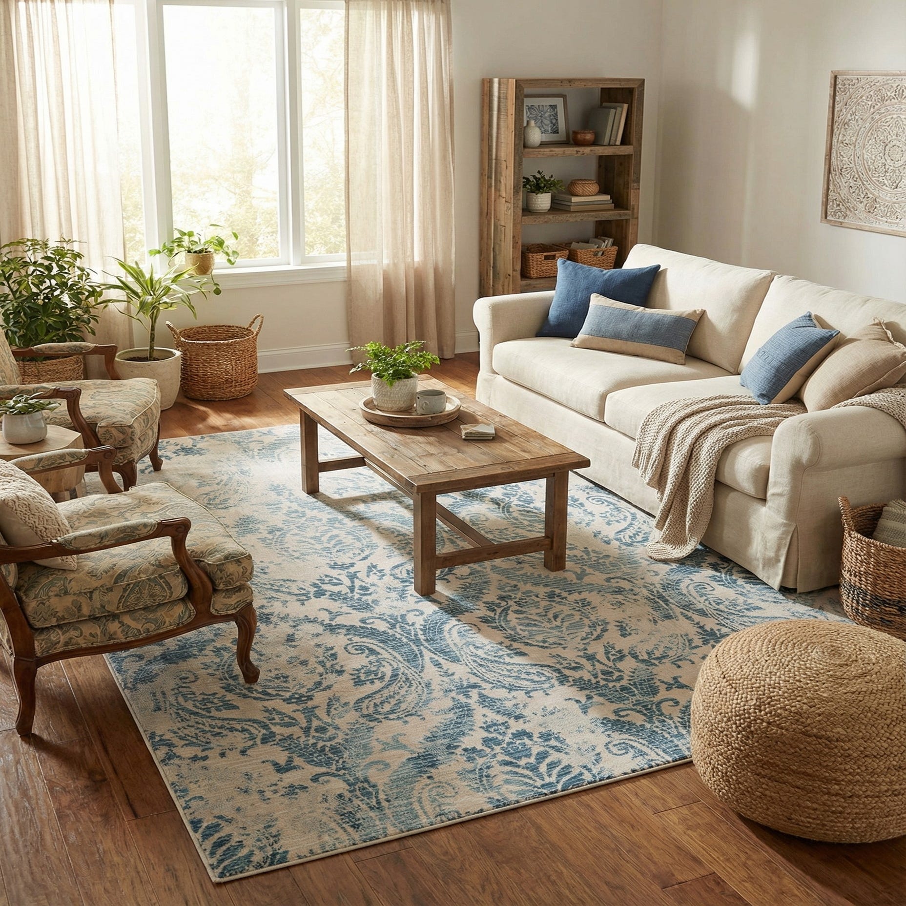 Woven from 100% polypropylene, the rug has a low, dense pile that feels smooth and slightly cushioned underfoot, with a subtle sheen where the light catches the raised pattern. Place it to anchor a living area with neutral sofas and painted wood furniture, layer it beneath a bed to introduce pattern and color to a serene bedroom, or use it in a dining room to lend classic character to modern chairs. Its blue-ground palette integrates easily with coastal, transitional, and softly traditional interiors.