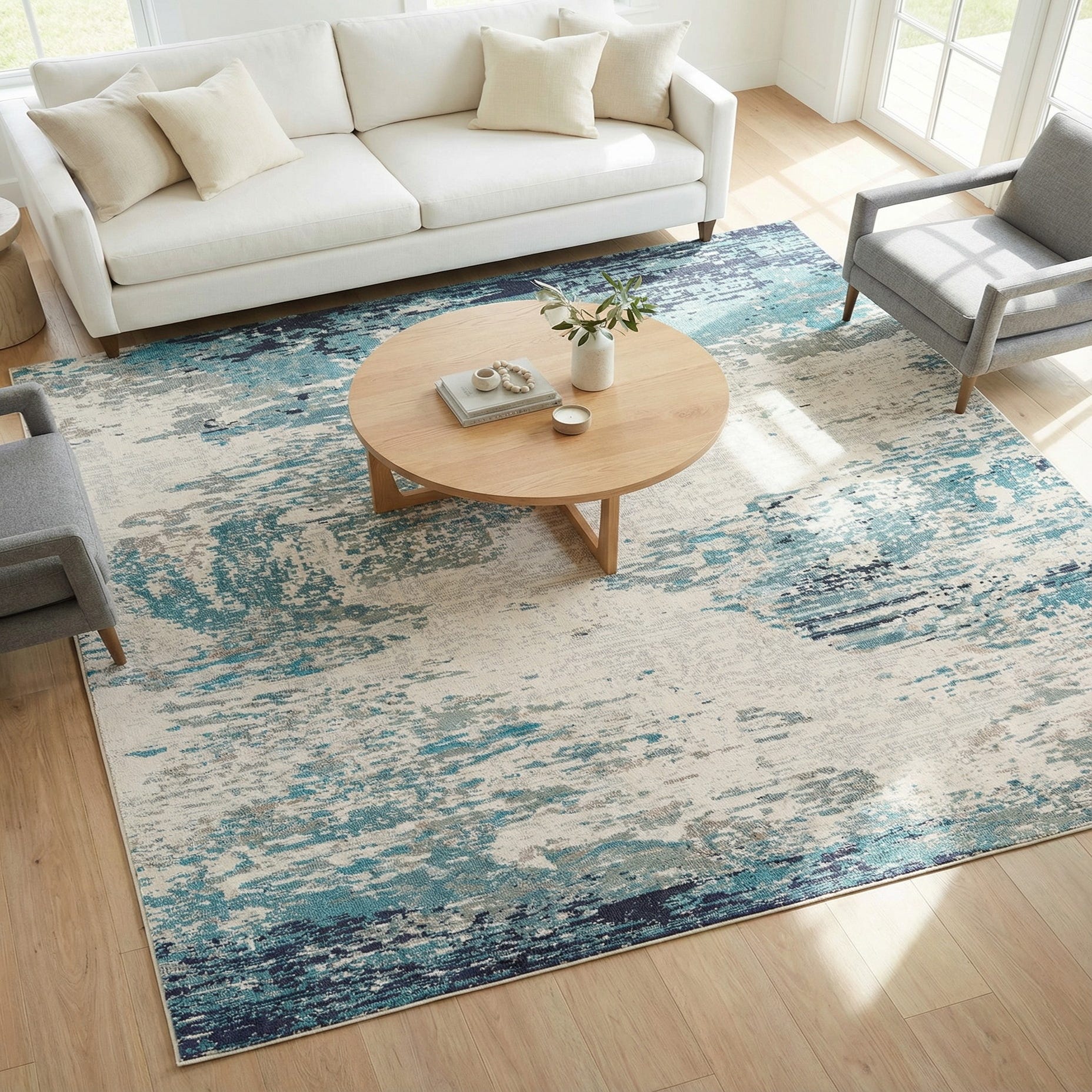 An abstract, painterly pattern unfolds across a blue background, with layered washes of light blue, navy, ivory and gray creating a soft, weathered effect. Areas of concentrated pigment sit beside more translucent, brushed sections, producing a contemporary, artful look that balances movement and calm. The irregular, distressed motif works as a subtle focal point without overwhelming a room’s other finishes.