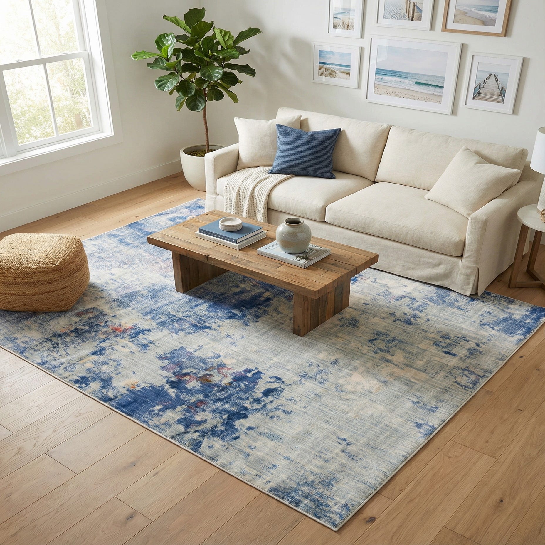 This rug fits well in contemporary, coastal, or transitional interiors—place it under a light-wood coffee table in a sunlit living room, beneath a neutral linen sofa to add quiet color, or centered in a bedroom to introduce soft, calming tones. It also pairs nicely with mixed metals and natural textures: think matte black or brass accents, woven baskets, and pale hardwood floors for a balanced, layered look.