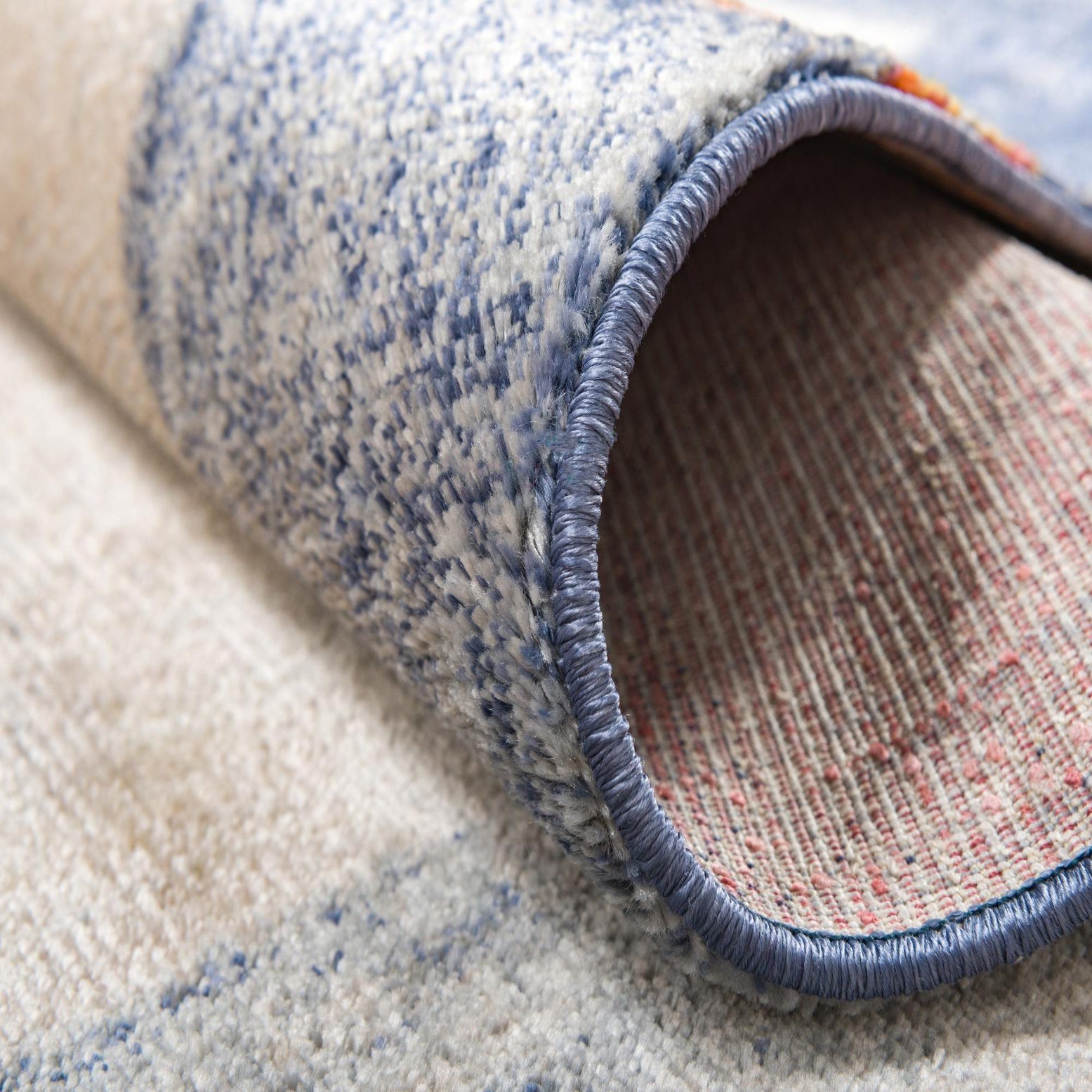 Primary color is Blue. Colors in this rug include: Blue, Gold, Light Blue, Navy Blue, Orange, Red.