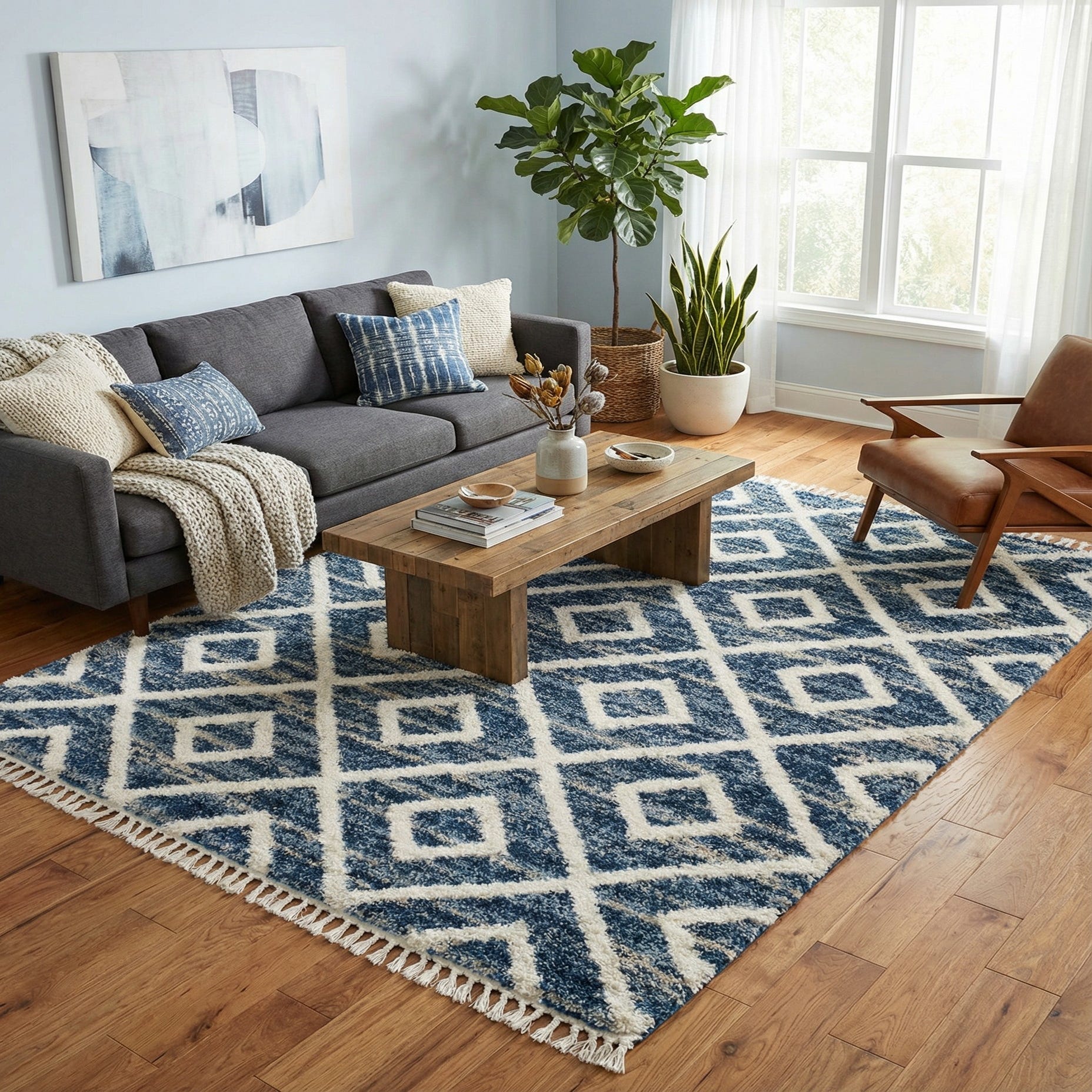 A bold geometric diamond pattern sits against a deep blue ground, with crisp ivory lines and soft beige highlights forming nested lozenges for a layered, dimensional look. The plush shag pile invites touch—thick, cushiony fibers with a gentle sheen that accentuates the variegated blue tones and gives the pattern a slightly lived-in, hand-tufted appearance. A short tassel fringe at the ends adds a relaxed, casual finish.