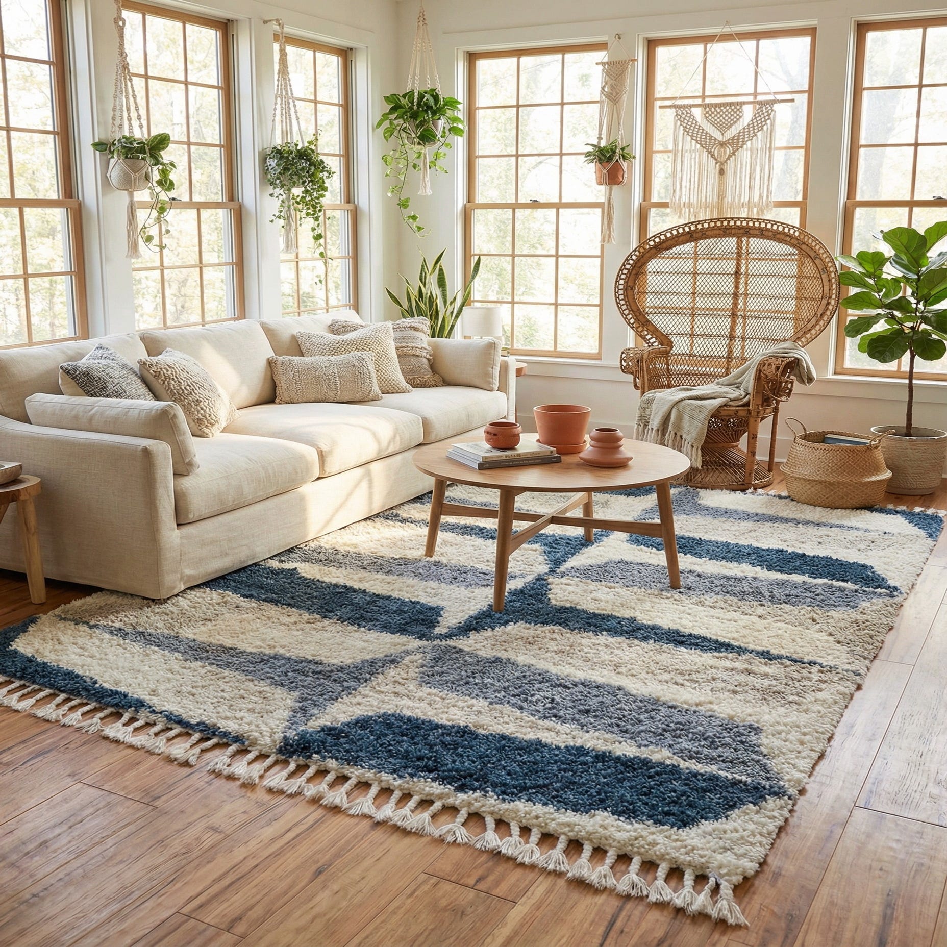 This rug works well in casual living rooms and family rooms where comfort and pattern matter, or layered in a bedroom to add a cozy, contemporary anchor beneath the bed. Pair it with light oak or walnut furniture and soft linen upholstery for a coastal-modern or mid-century inspired setting, or combine with navy throw pillows and brass accents for a more refined, contemporary scheme.