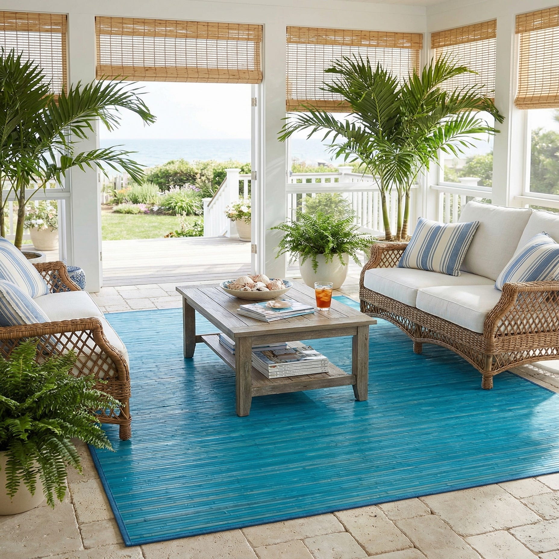 Machine made from 100% bamboo, this rug makes a calm, grounded foundation for contemporary, coastal, or mid-century modern interiors. It works well under a sofa or coffee table to define a seating area, beneath a dining table to add texture without bulk, or in a sunroom or home office where a cool blue anchor complements natural light. Pair it with light wood or rattan furniture, crisp white linens, and warm metallic accents for a balanced, layered scheme.