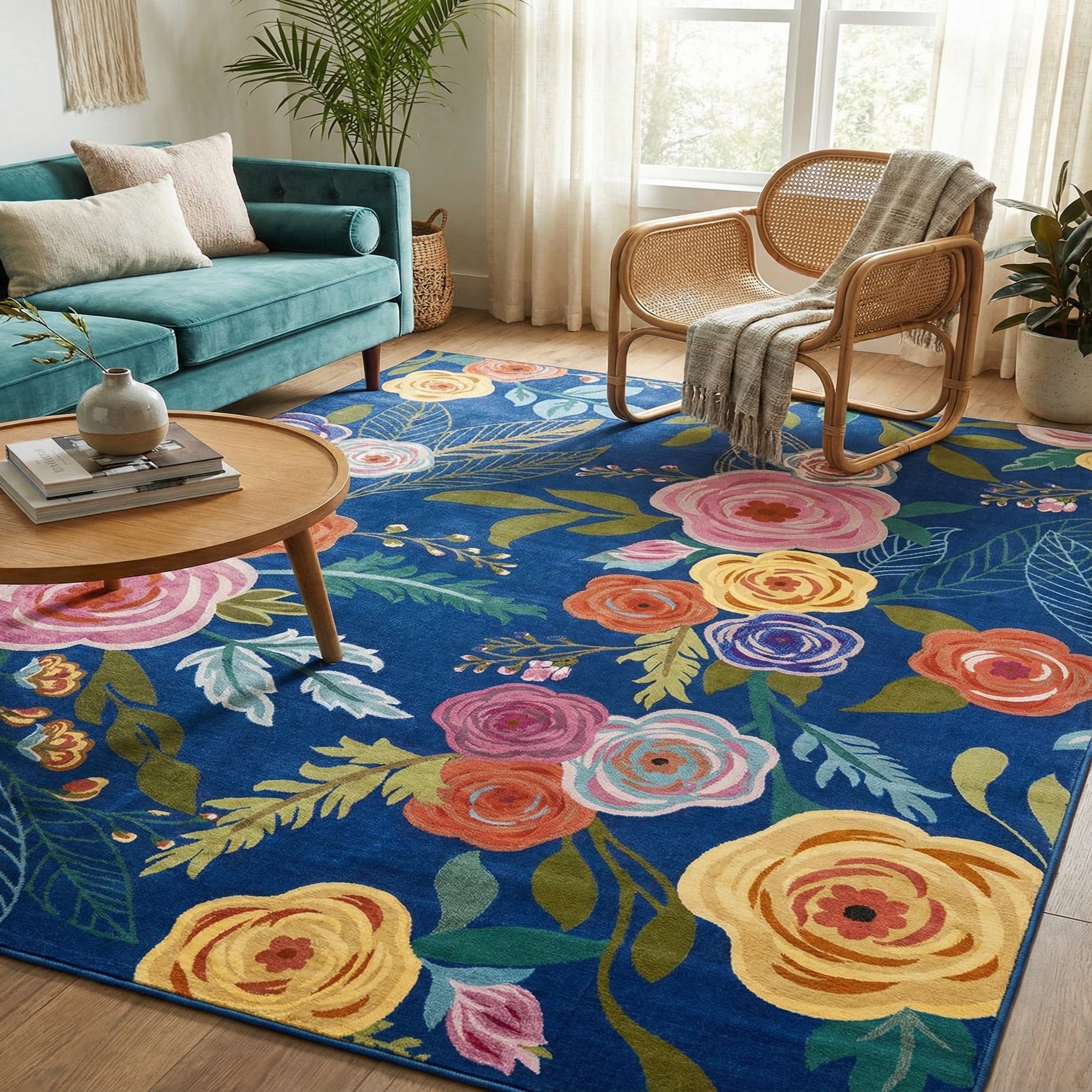 Primary color is Blue. Colors in this rug include: Blue, Olive, Rust Red, Yellow, Pink, Violet, Light Green, Light Blue.