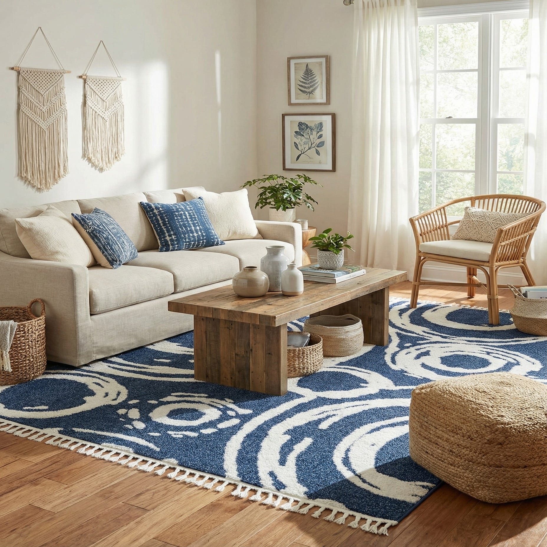 Part of the Boho Collection, this rug is a captivating addition to any room, crafted with a 100% polyester pile for durability and softness. The design features a dynamic pattern of abstract, swirling circles that create a sense of movement across the blue background, complemented by contrasting ivory hues. This rug measures 8x10, offering a generous size designed to anchor living spaces or dining areas with ease.