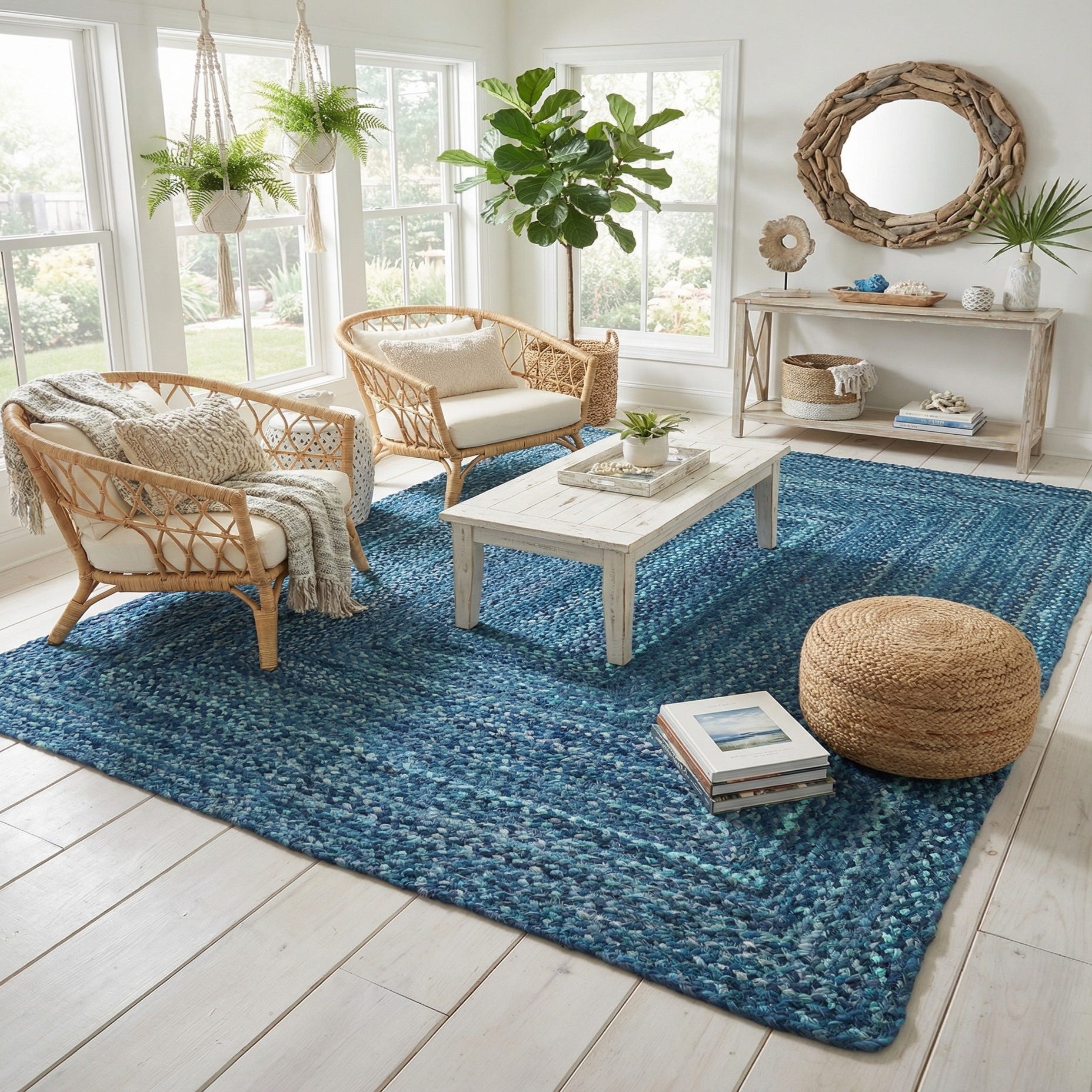 The rug’s casual, coastal-leaning style pairs well with light wood floors, painted white furnishings, and woven accents like rattan or seagrass. Use it to anchor a seating group in a family room or sunroom, soften a dining area under a table, or add color and texture to a bedroom layered with neutral linens. The cool blue palette complements navy accents and soft neutrals for a calm, collected interior.