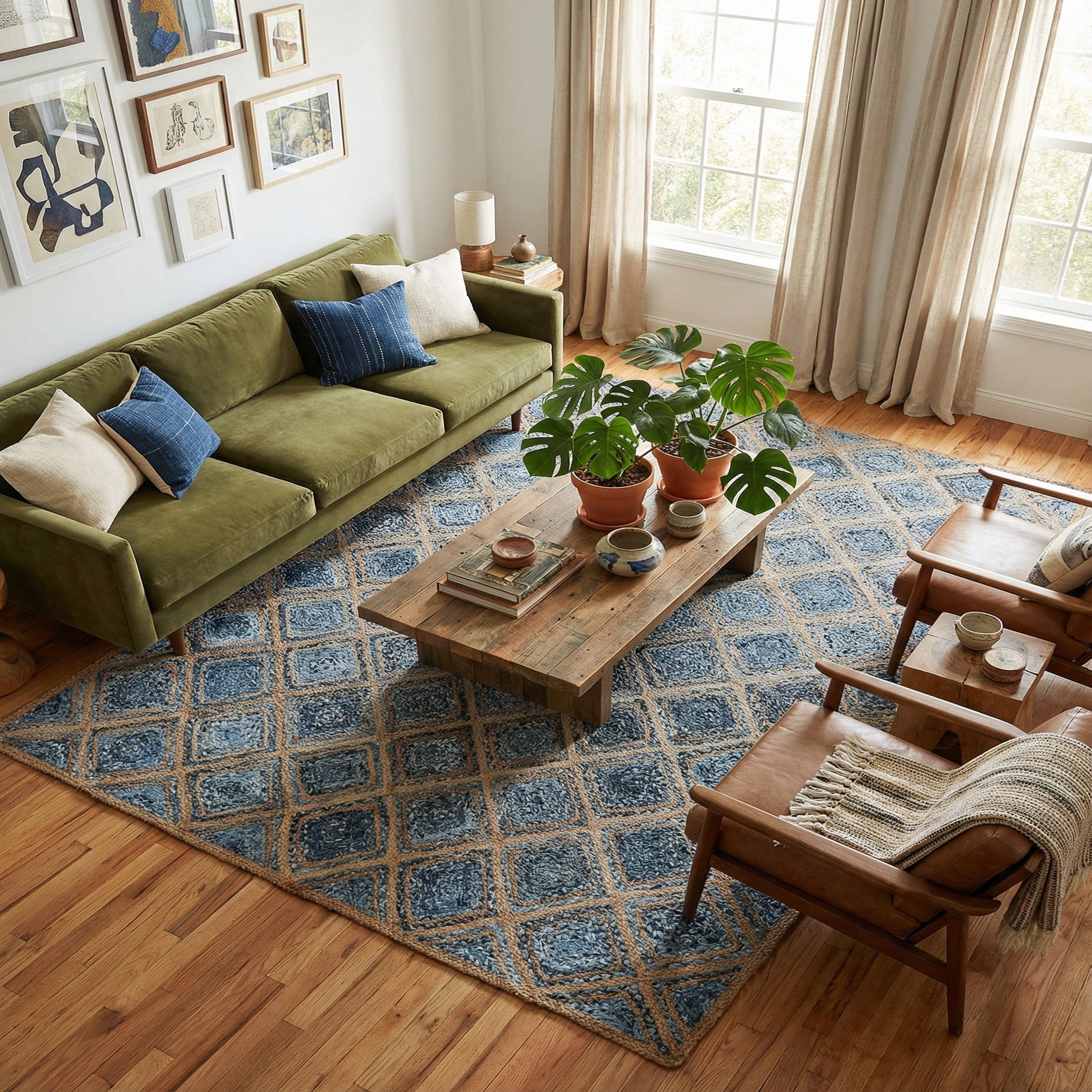 Hand-braided from 80% denim cotton and 20% jute, this rug presents a repeating diamond lattice on a blue background. Beige jute cords trace each diamond, forming a warm, natural grid that frames tightly braided denim-cotton centers in varying blues and navy blue accents. The surface pairs softer denim fibers with firmer jute braids for a layered hand—comfortable underfoot yet with clear tactile definition—and a neat jute-wrapped edge that contains the pattern.