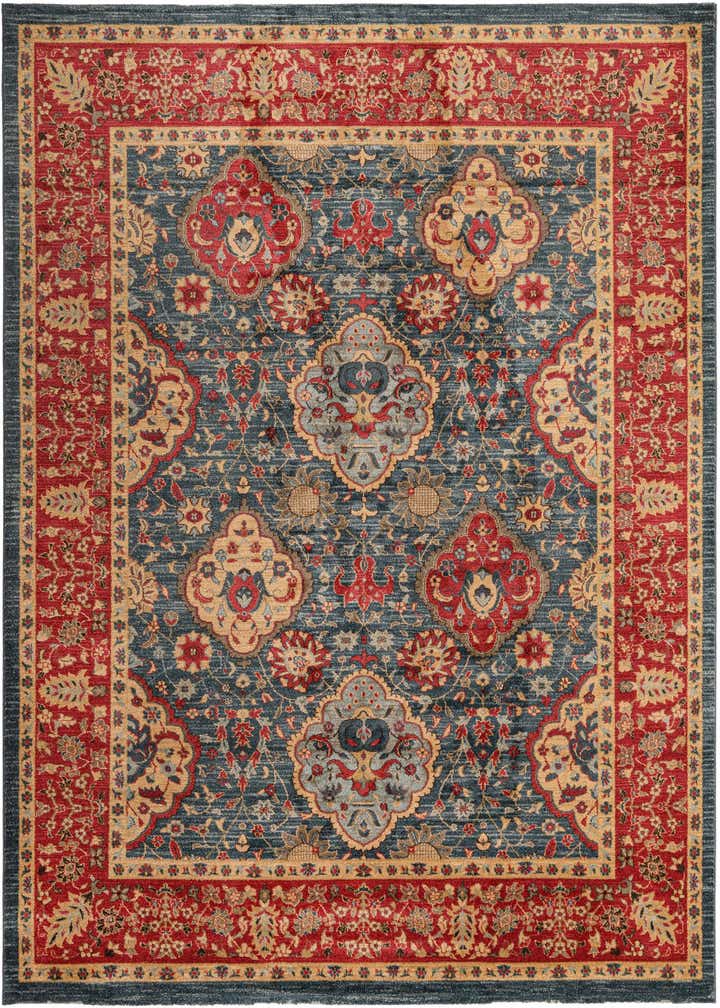 Primary color is Blue. Colors in this rug include: Blue, Red, Beige, Cream, Light Blue.