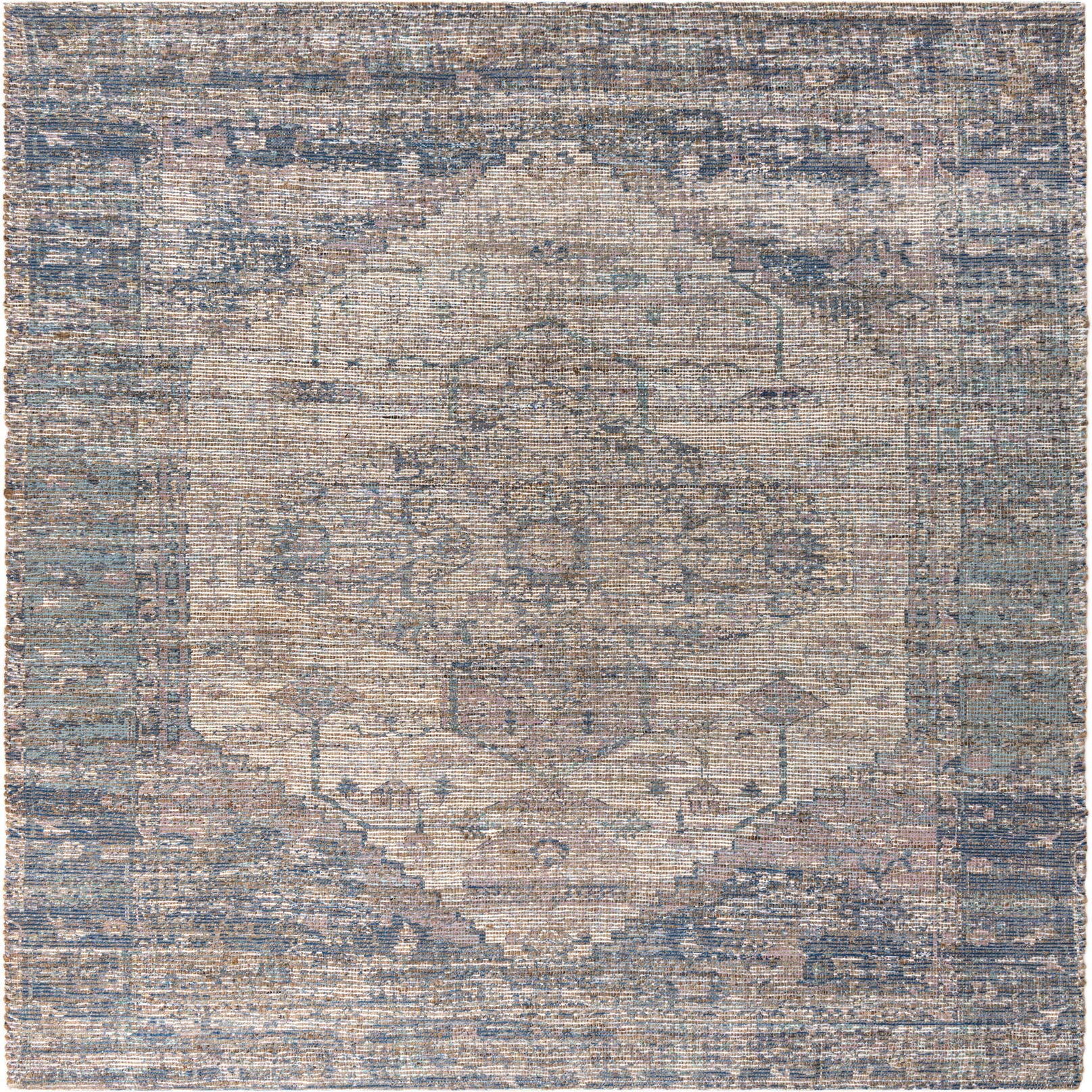 The Chenille Jute 8x10 rug is a handwoven piece, artfully crafted from polyester chenille and jute to offer durability along with its tactile appeal. The rug displays a distressed pattern that melds traditional motifs with a modern aesthetic, featuring an interplay of colors such as Blue, Ivory, Light Blue, and Violet set against a Blue background. The variegated tones create a subtle, visually textured appearance, adding depth and interest to any space.