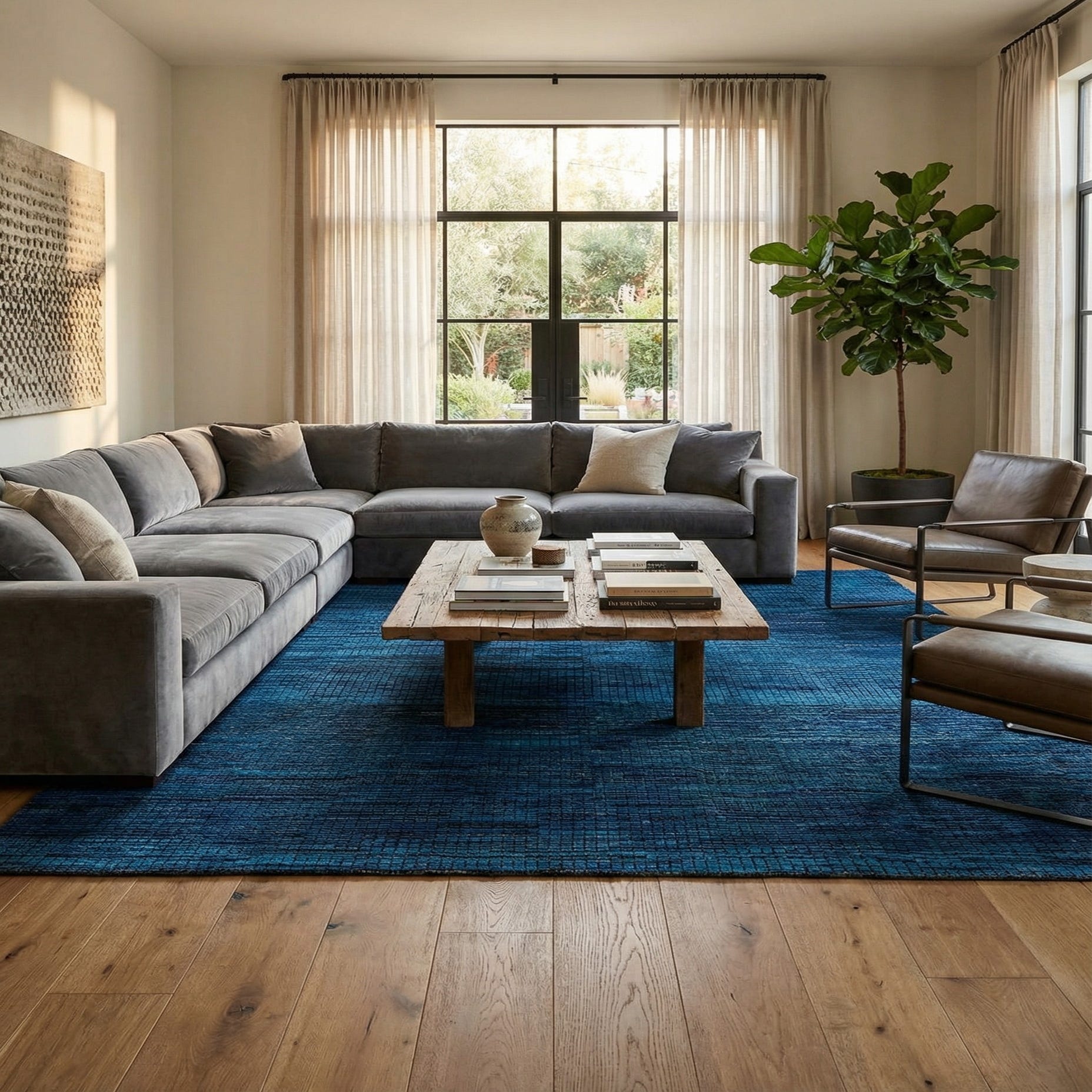 Primary color is Blue. Colors in this rug include: Blue, Black.