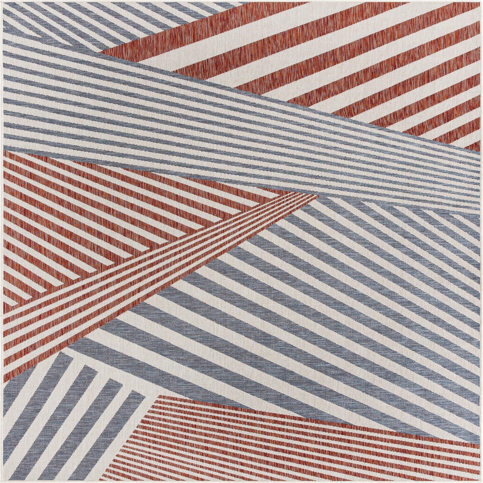 An 8x10 rectangular indoor/outdoor rug featuring a modern eclectic stripe pattern in shades of blue and terracotta.