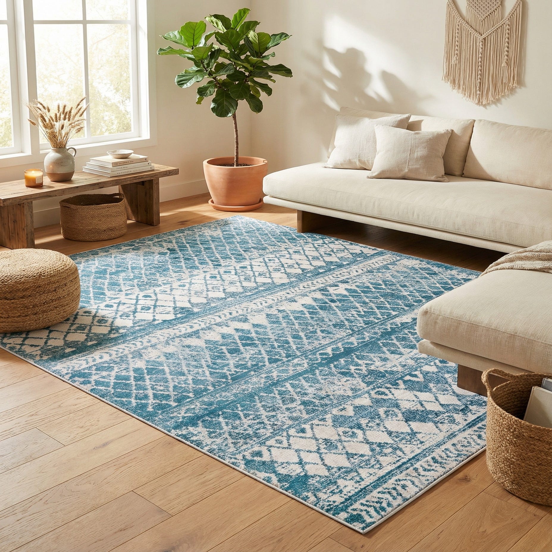 Machine made from 75% polypropylene and 25% polyester, the rug has a low-profile pile with a smooth, slightly cushioned hand and a faint, soft sheen from the polyester fibers. It works well as an anchor in a living room beneath a coffee table, layered in a casual bedroom, or placed in an entry or dining area to add pattern without overwhelming the space. Pair it with light wood tones, neutral upholstery, or coastal and transitional furnishings for a cohesive, calm interior.