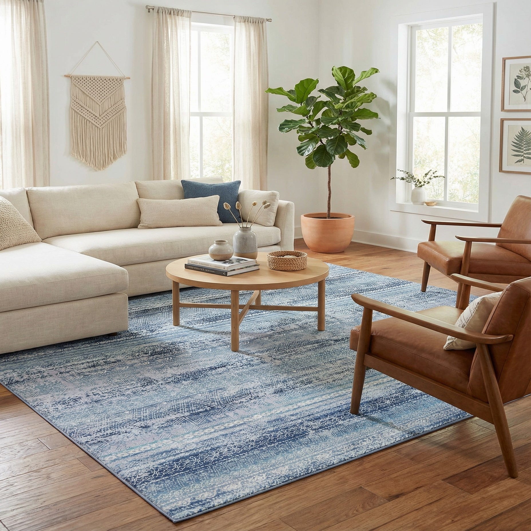 This piece works well in coastal, modern casual, or transitional interiors. Place it beneath a coffee table to anchor a linen sofa and woven textures, layer it under the lower two-thirds of a bed to add color and pattern without overpowering the room, or set it in a sunroom or home office to introduce a calm, layered look. It pairs nicely with white-painted furniture, weathered woods, navy accents, and brass or chrome fixtures for a pulled-together, approachable aesthetic.