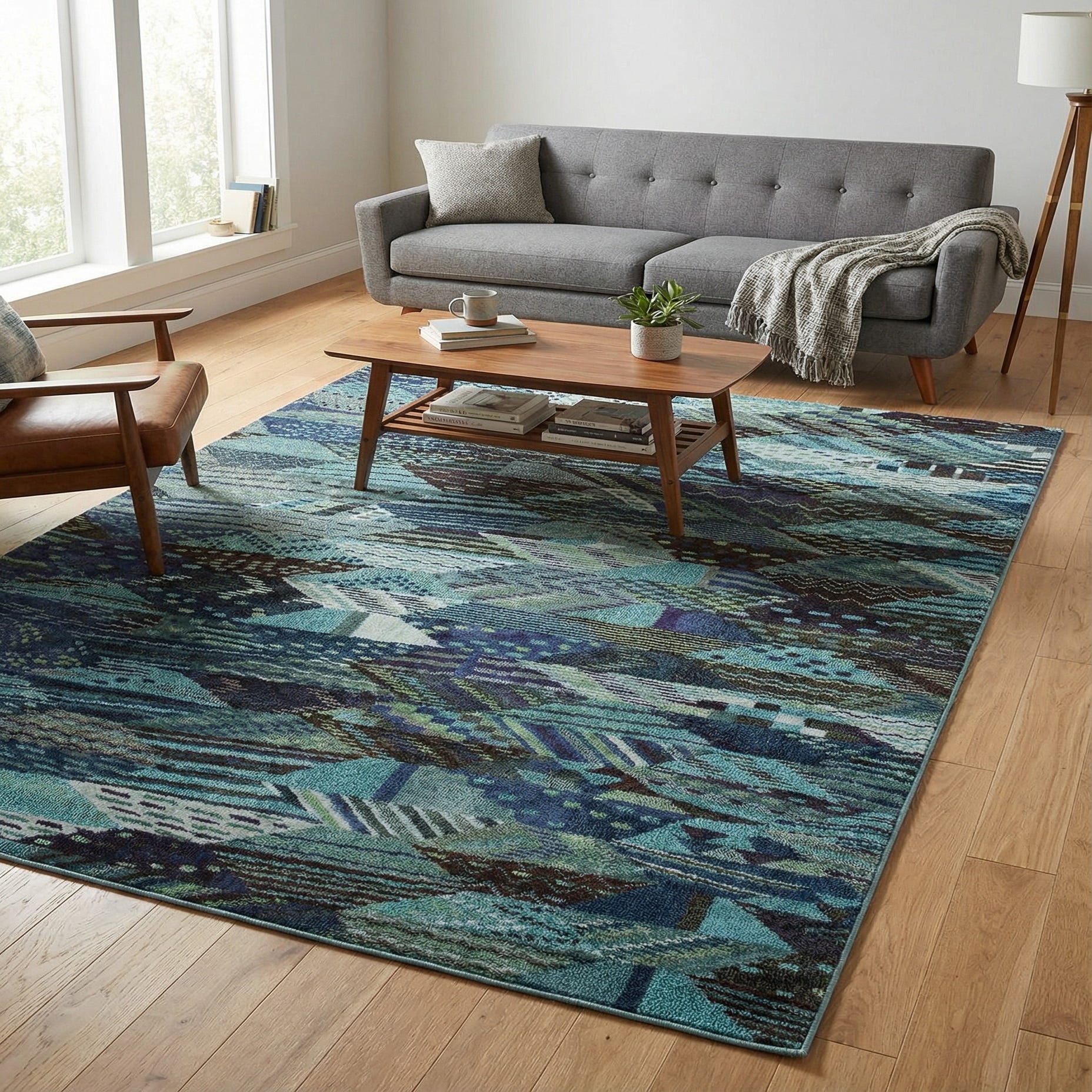 Pair this rug with a navy or neutral sofa and light wood furniture for a contemporary living room anchor, or use it to bring cool color into a coastal-inspired space. It also works well under a dining table in an open-plan area, or layered in a home office to add pattern without overwhelming the room. The color mix complements matte metal accents, mid-century silhouettes, and soft linen textiles for a balanced, lived-in look.