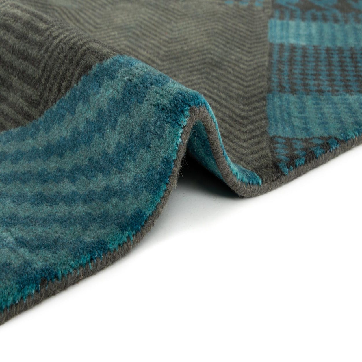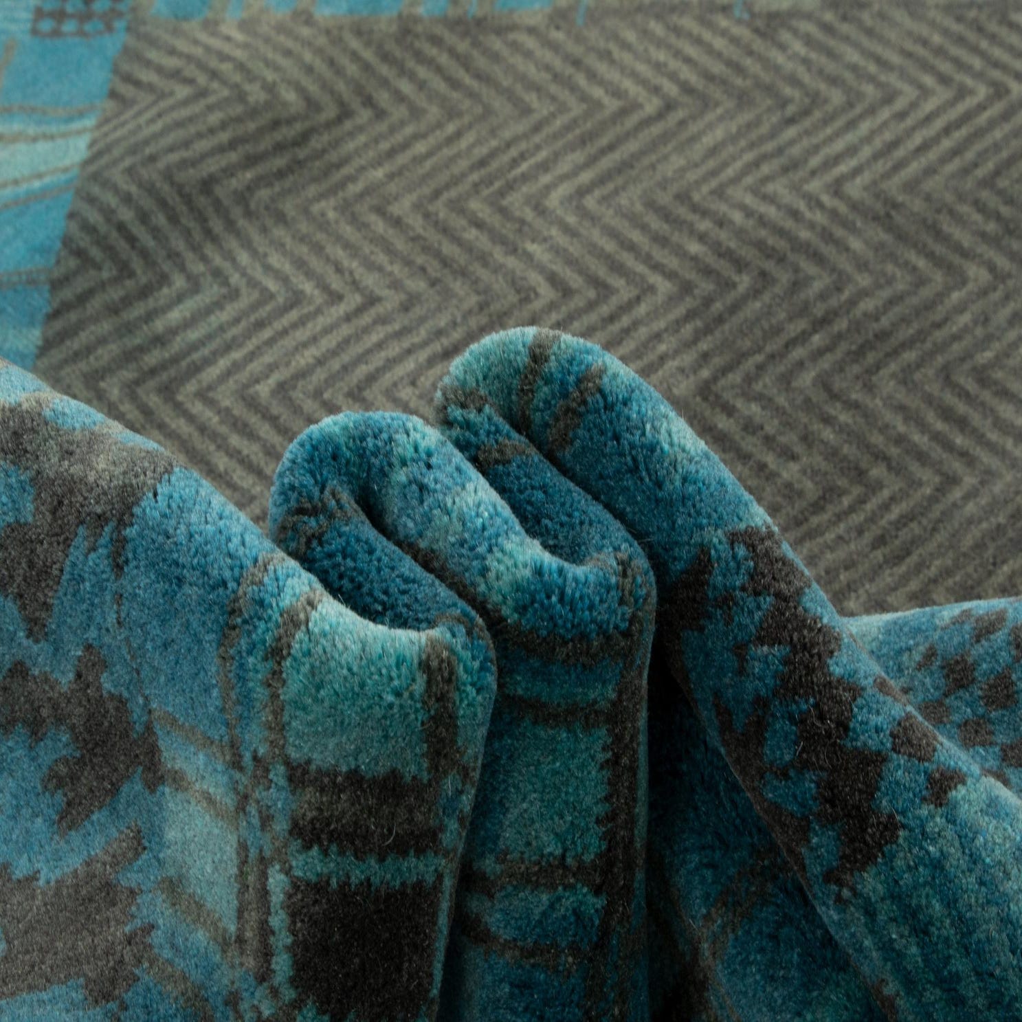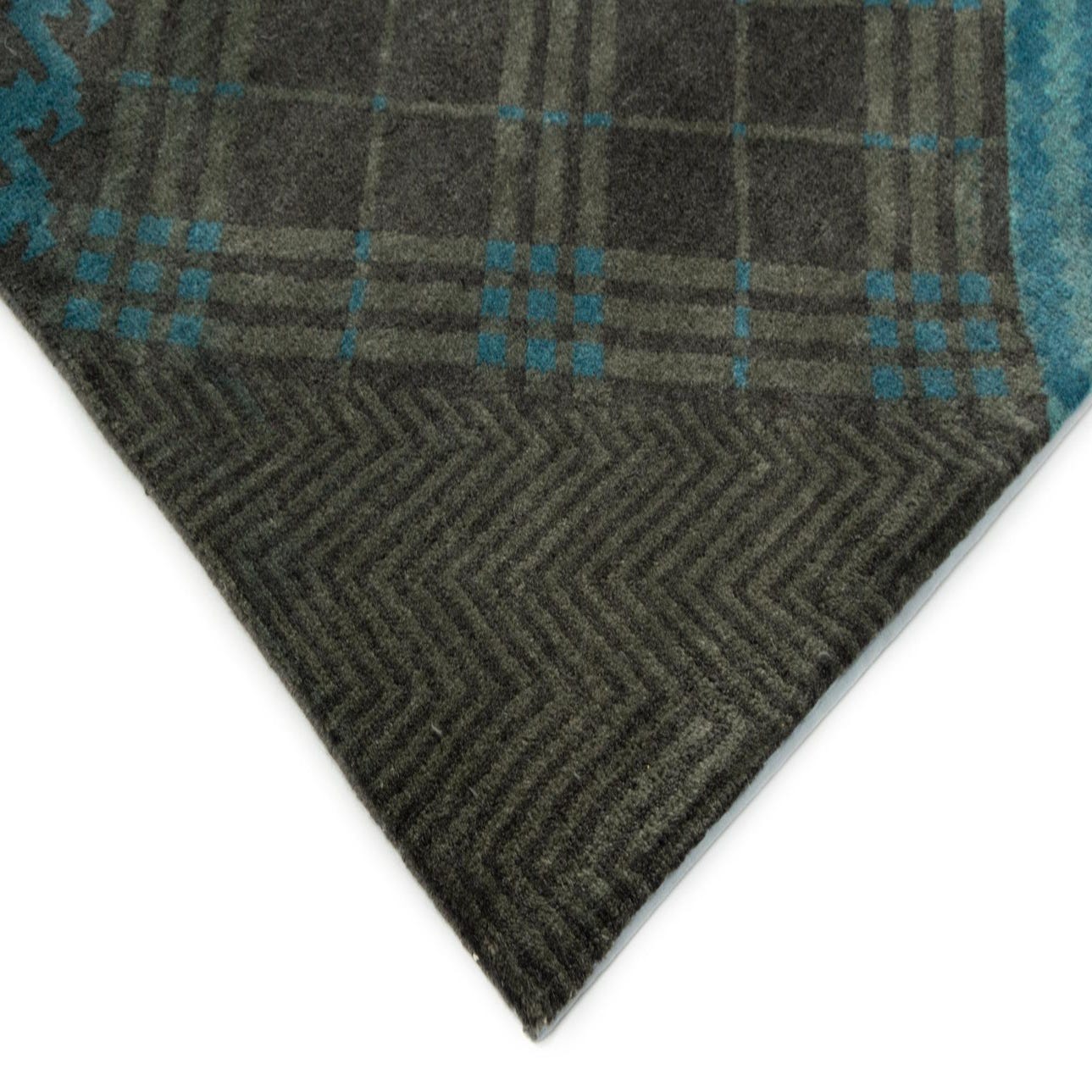 Primary color is Blue. Colors in this rug include: Blue, Grey, Turquoise.