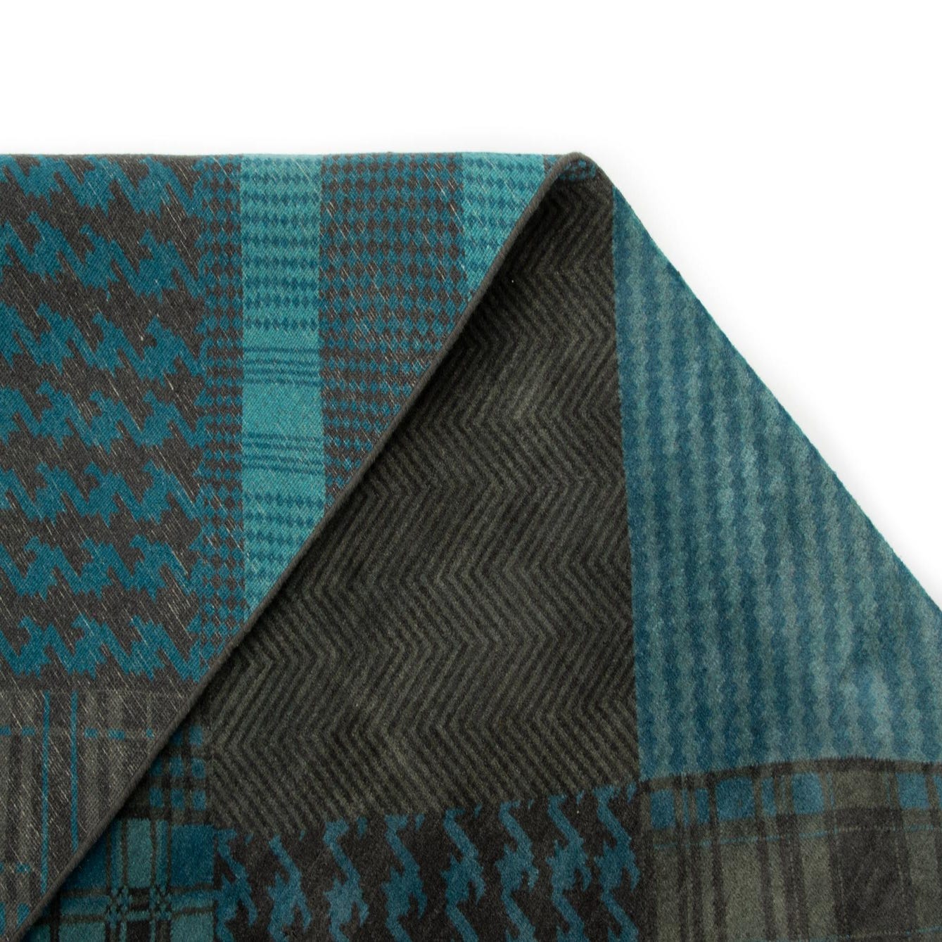 A rectangular 8x10 Modern Manshu rug featuring a patchwork of blue and dark gray plaid, houndstooth, and striped patterns, ideal for a living room.