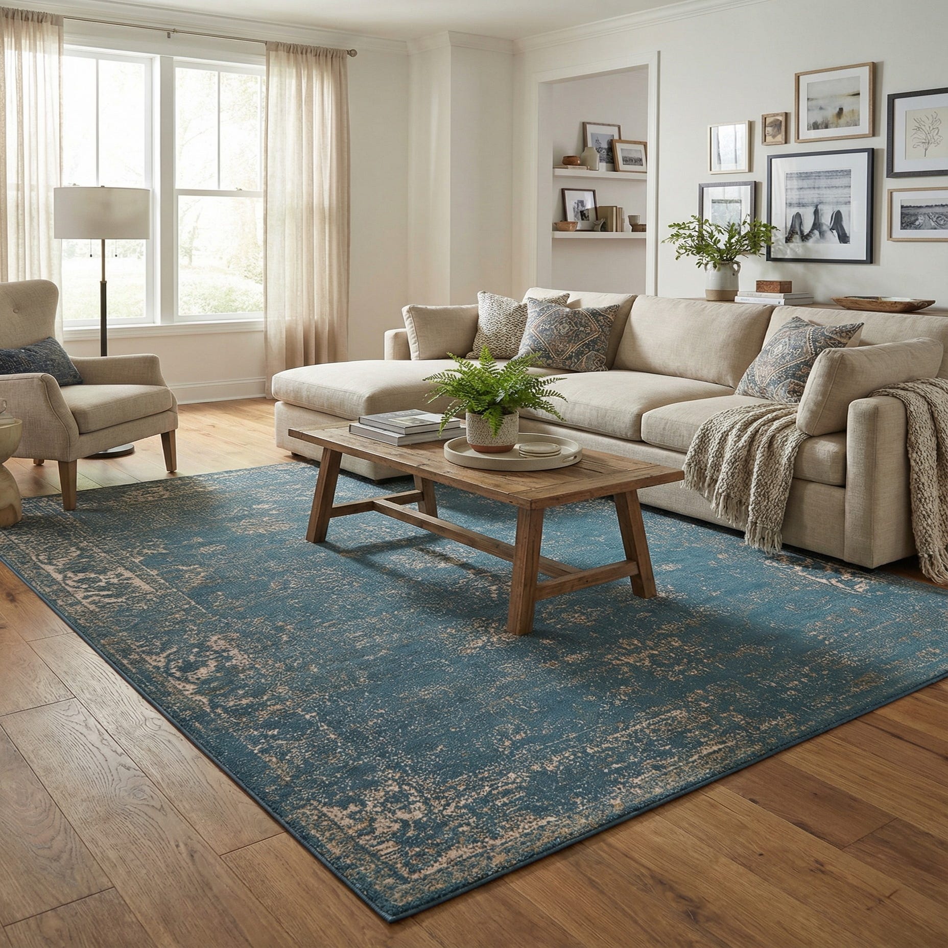 A distressed, vintage-inspired medallion pattern sits on a rich blue background, with beige and tan accents layered across the field and along a subtle border. The deliberate wear and variation in color create a lived-in, dimensional look where floral motifs and linear details peek through the surface. Machine-made of 100% polypropylene, the rug has a low pile that lies flat and a soft, slightly dense hand underfoot—smooth to the touch while still offering a noticeable presence beneath furniture.