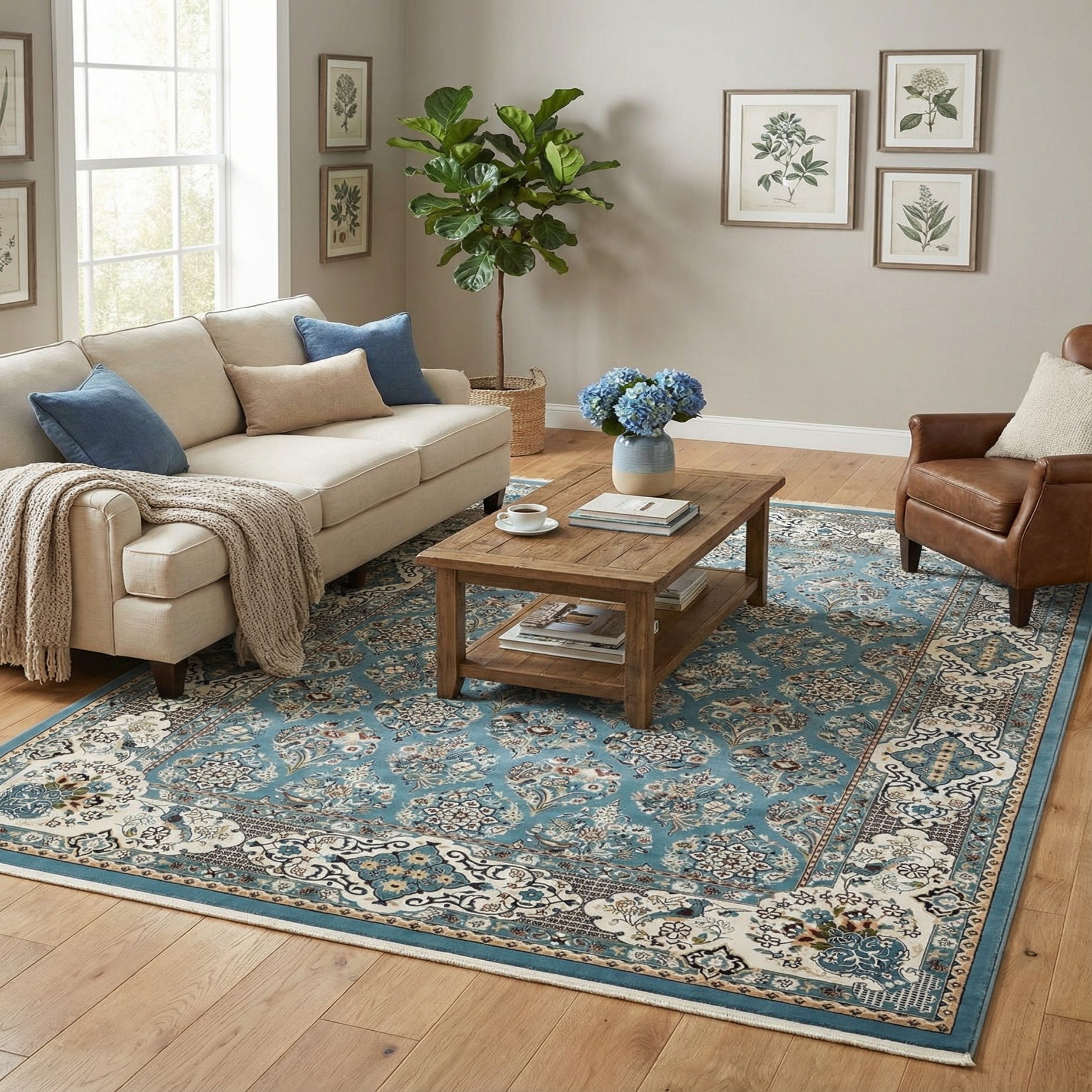 This piece works well beneath a living room seating group to anchor sofas and chairs, paired with warm wood tones or navy upholstery for a traditional look, or placed in a bedroom to introduce color and pattern under the bed. It also complements clean-lined contemporary furnishings—its pattern adds visual interest without overwhelming a modern scheme—making it a versatile option for formal dining rooms, studies, or everyday family spaces.