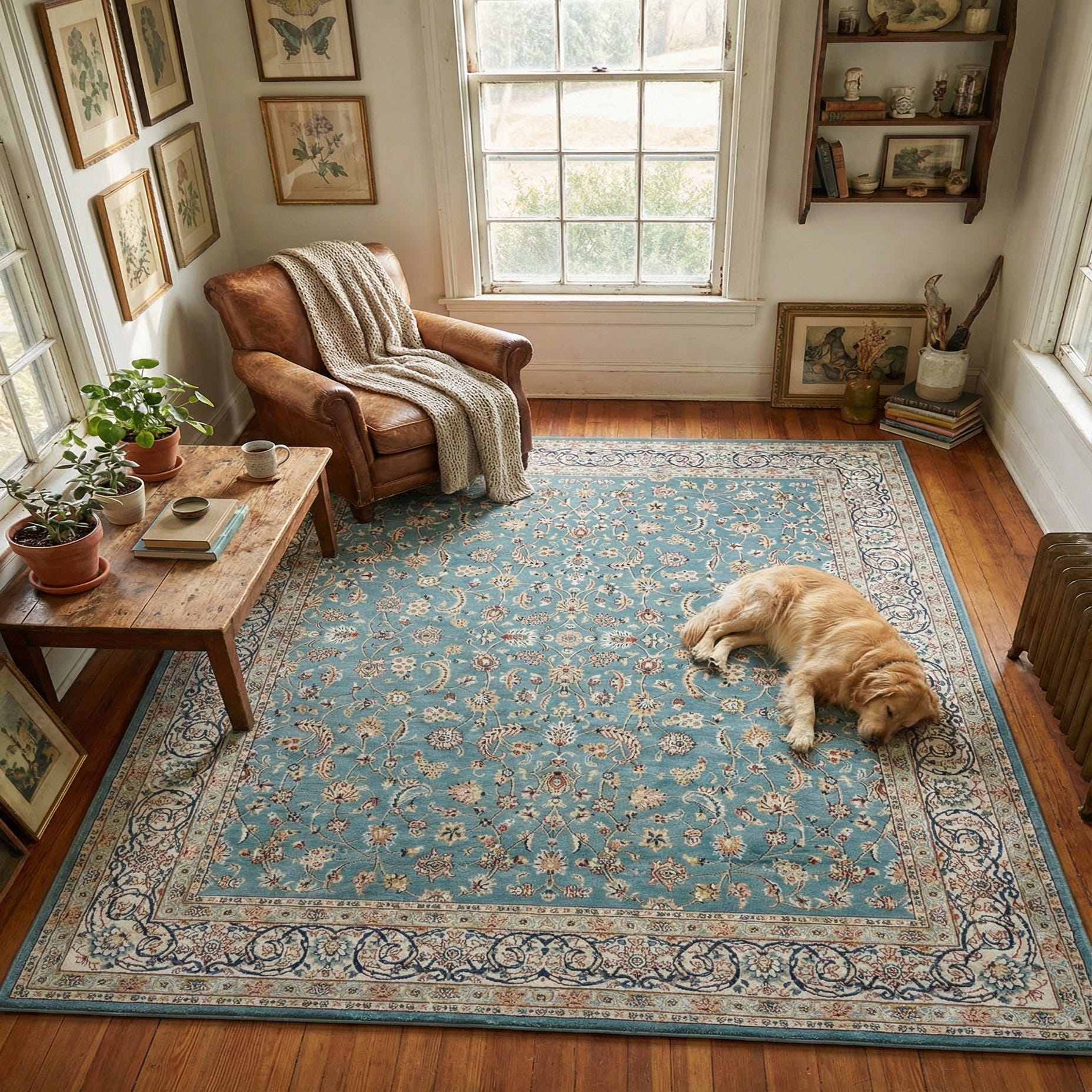 This rug works well as the anchor for a classic living room with warm wood furniture and cream upholstery, or in a formal dining space beneath a dark wood table to introduce layered color and pattern. It also pairs nicely with navy sofas and light-blue accents in transitional or coastal-inspired rooms, and can soften a bedroom when layered with neutral bedding and textured throws. The balanced palette adapts easily to both traditional interiors and spaces that mix antique pieces with cleaner, contemporary lines.