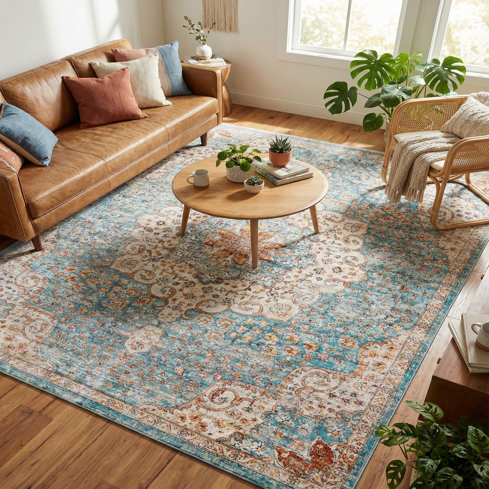 Machine-made of 100% polypropylene, the rug has a low, tightly woven pile that feels smooth underfoot and holds pattern definition well. Its color palette and traditional-inspired design work well in transitional interiors, coastal living rooms, or a relaxed formal dining space; pair it with light woods and linen upholstery for a breezy look, or with warm leather and brass accents to draw out the terracotta and rust tones. It also layers nicely under a bed to add pattern and color while keeping the room grounded.