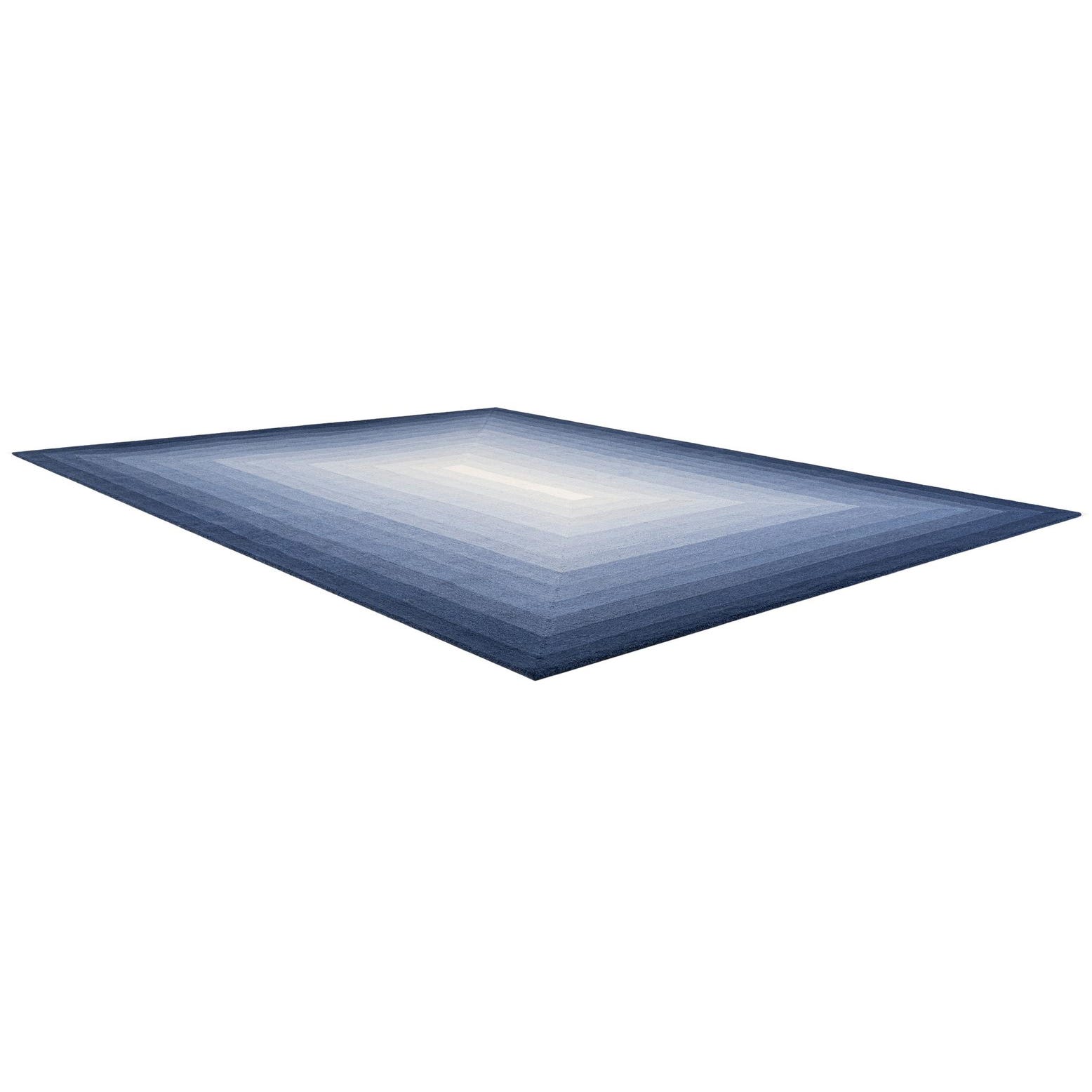 A rectangular 8x10 blue wool rug featuring an ombre effect, transitioning from dark navy blue edges to a light blue center.