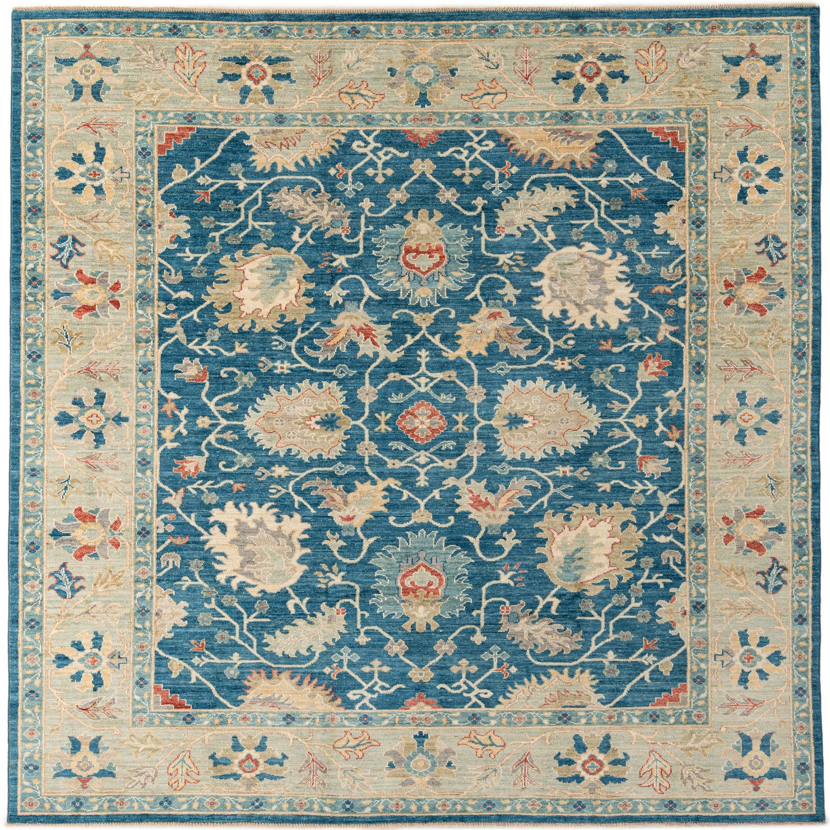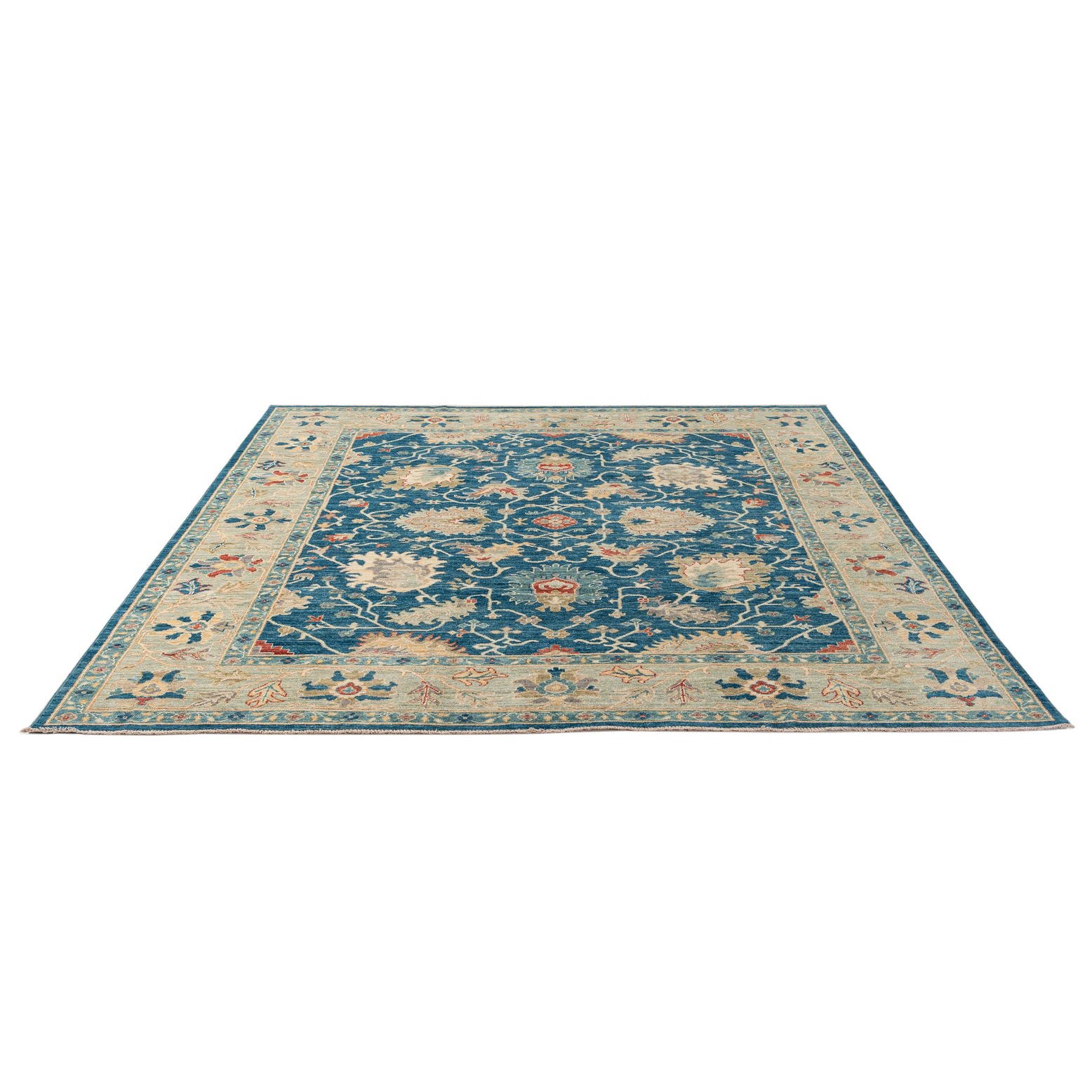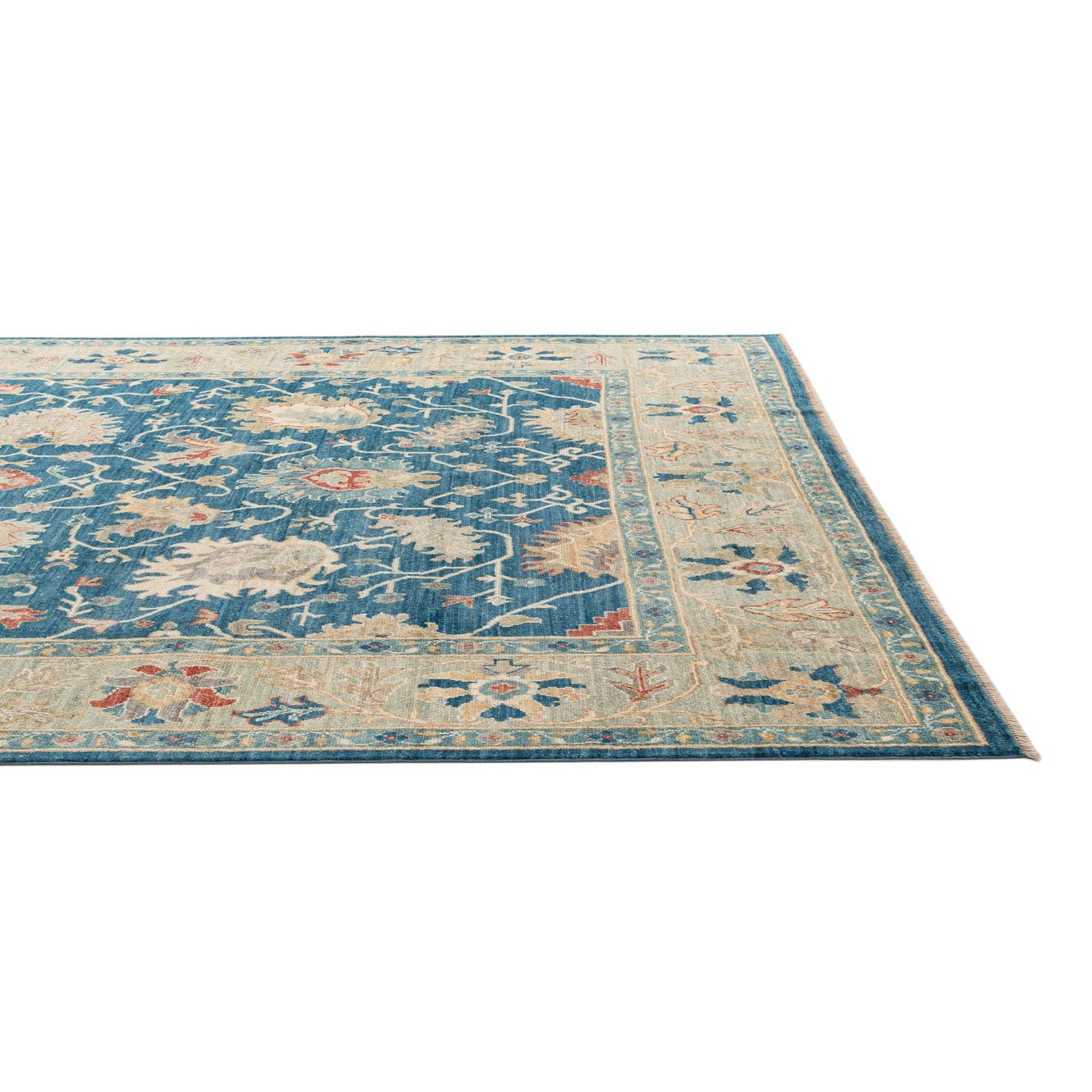 An 8x10 rectangular Oushak rug in shades of blue with a cream and light blue border, featuring an intricate floral and vine pattern.