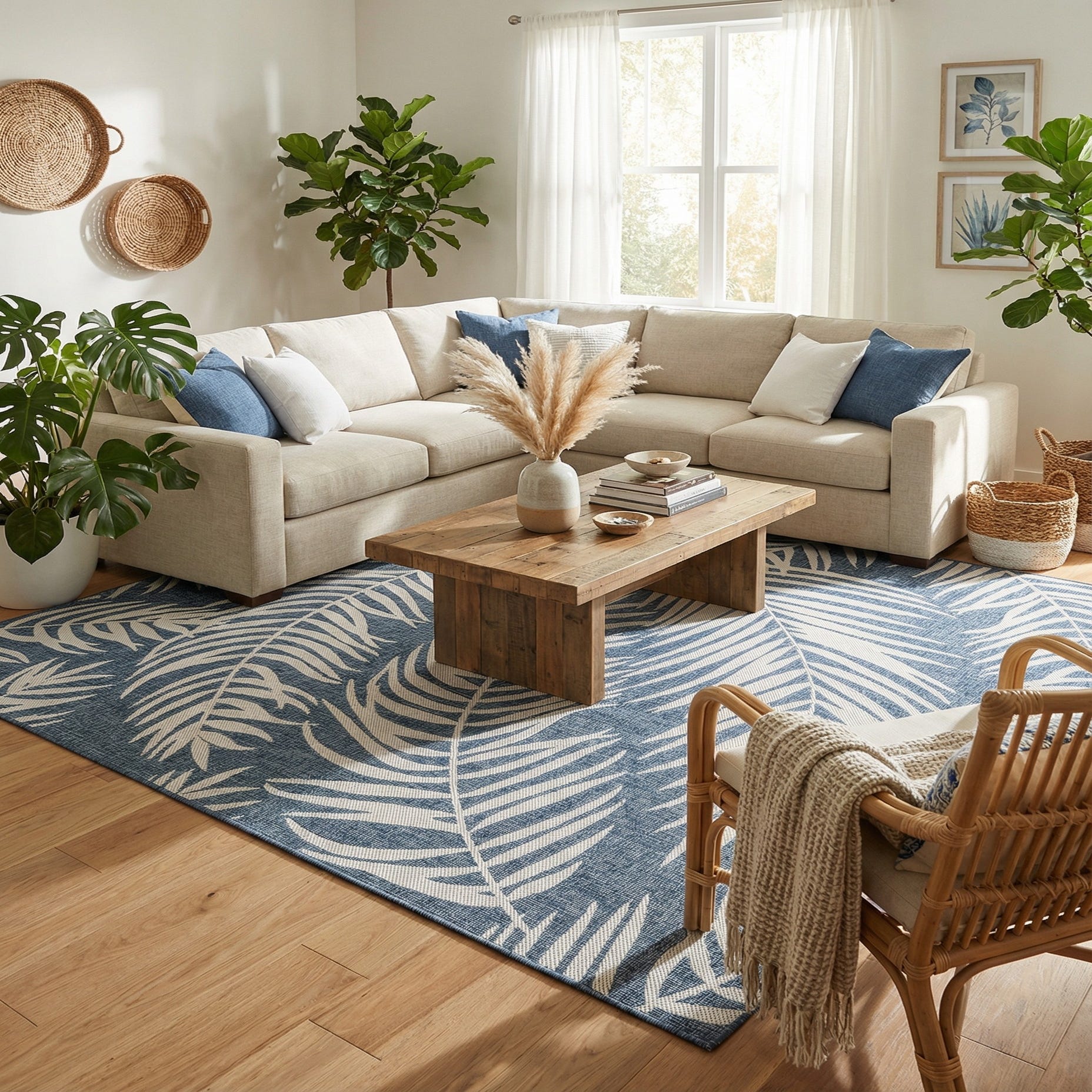 Place this rug on a covered patio or sunroom to anchor wicker seating and navy cushions, or use it in a living room with natural wood furniture and white linen upholstery for a breezy, layered look. It also works well under a casual dining table or in a beach house entry, where the blue-and-ivory palette complements rattan, painted wood, and metal accent pieces.