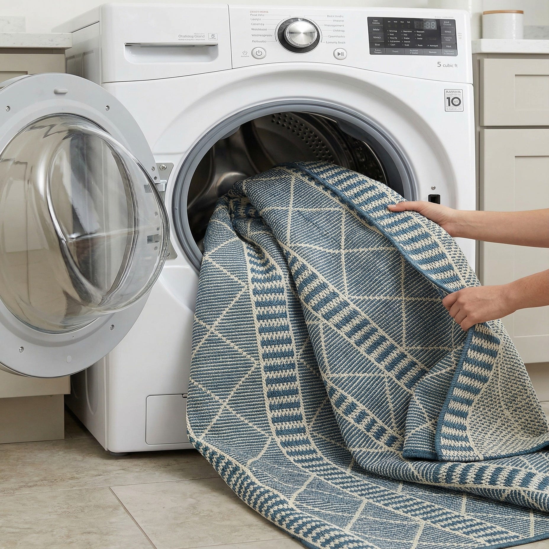This durable construction performs well in outdoor settings like covered patios, screened porches, and poolside lounges, and it also works indoors in sunrooms, casual dining areas, or entryways. The blue-and-ivory palette complements coastal, modern, and farmhouse schemes—pair it with light wicker seating and linen cushions for a relaxed patio arrangement, or anchor a bright sunroom with white-painted furniture and natural-fiber accents for a fresh, layered look.