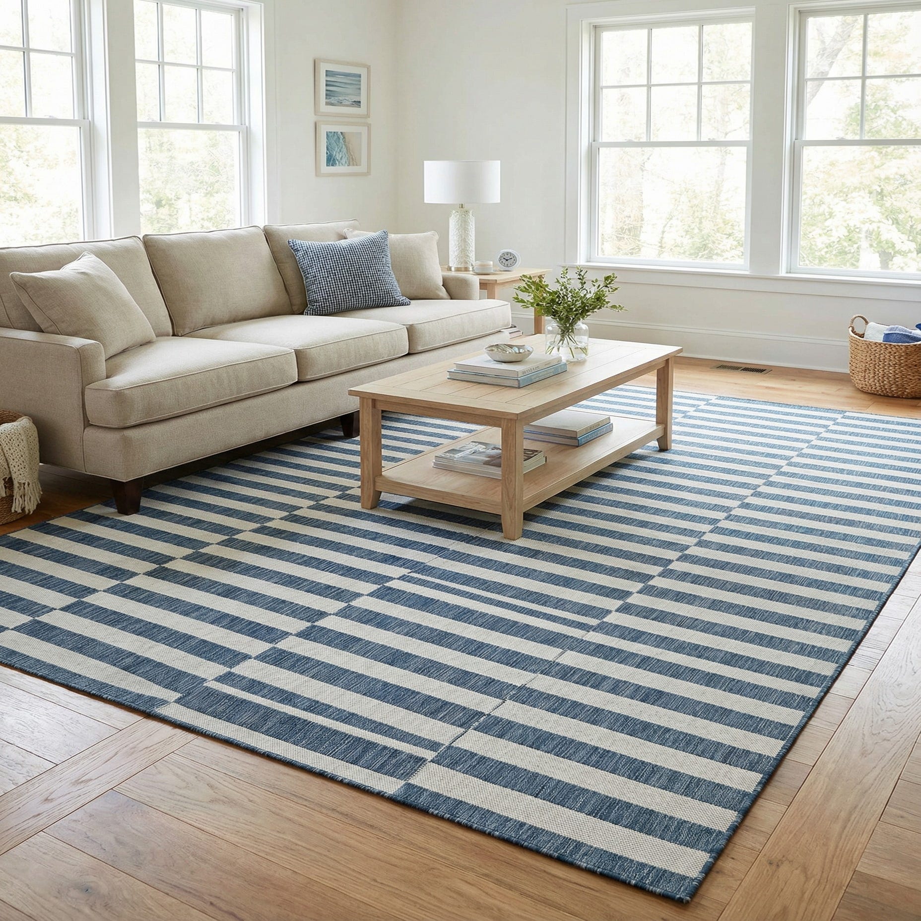 This piece fits easily into casual coastal, contemporary, or transitional settings. Use it on a covered patio or lanai beneath a conversation set, in a sunroom paired with light-weathered wicker and navy accents, or under a simple dining table to ground a breezy, relaxed scheme. The blue, ivory, and navy palette pairs well with natural fibers, white-painted wood, and brushed metal for a fresh, lived-in look.