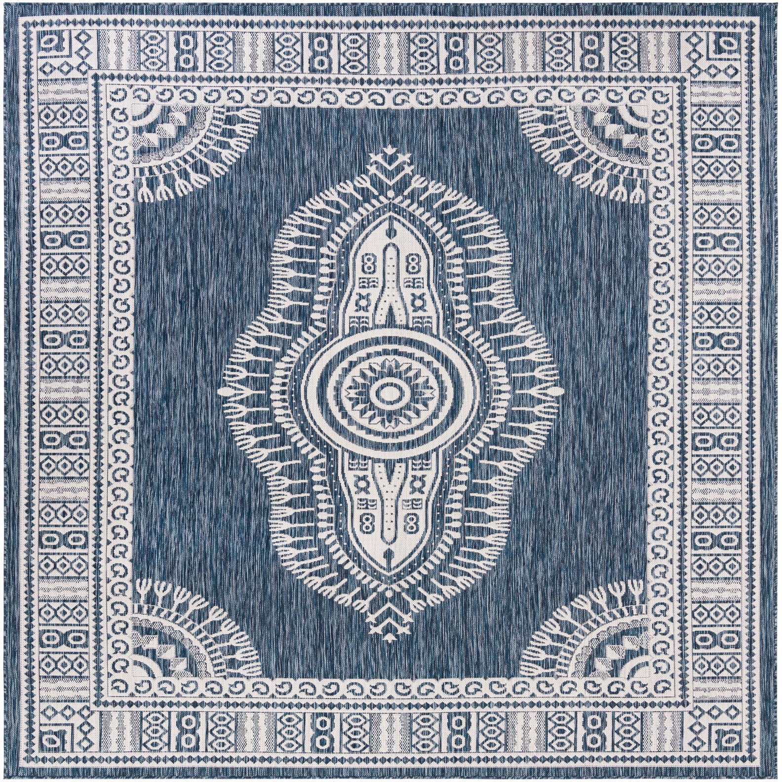 This machine-made outdoor rug is crafted from 100% polypropylene and showcases a classic medallion layout in ivory set against a rich blue background. A central oval motif surrounded by radiating filigree and stylized fringe anchors the field, while layered geometric borders add rhythmic detail along the edges. The low-profile, flat-woven construction feels slightly firm with a subtle ribbed texture underhand, so the pattern reads crisply and the surface maintains a neat, tailored appearance.