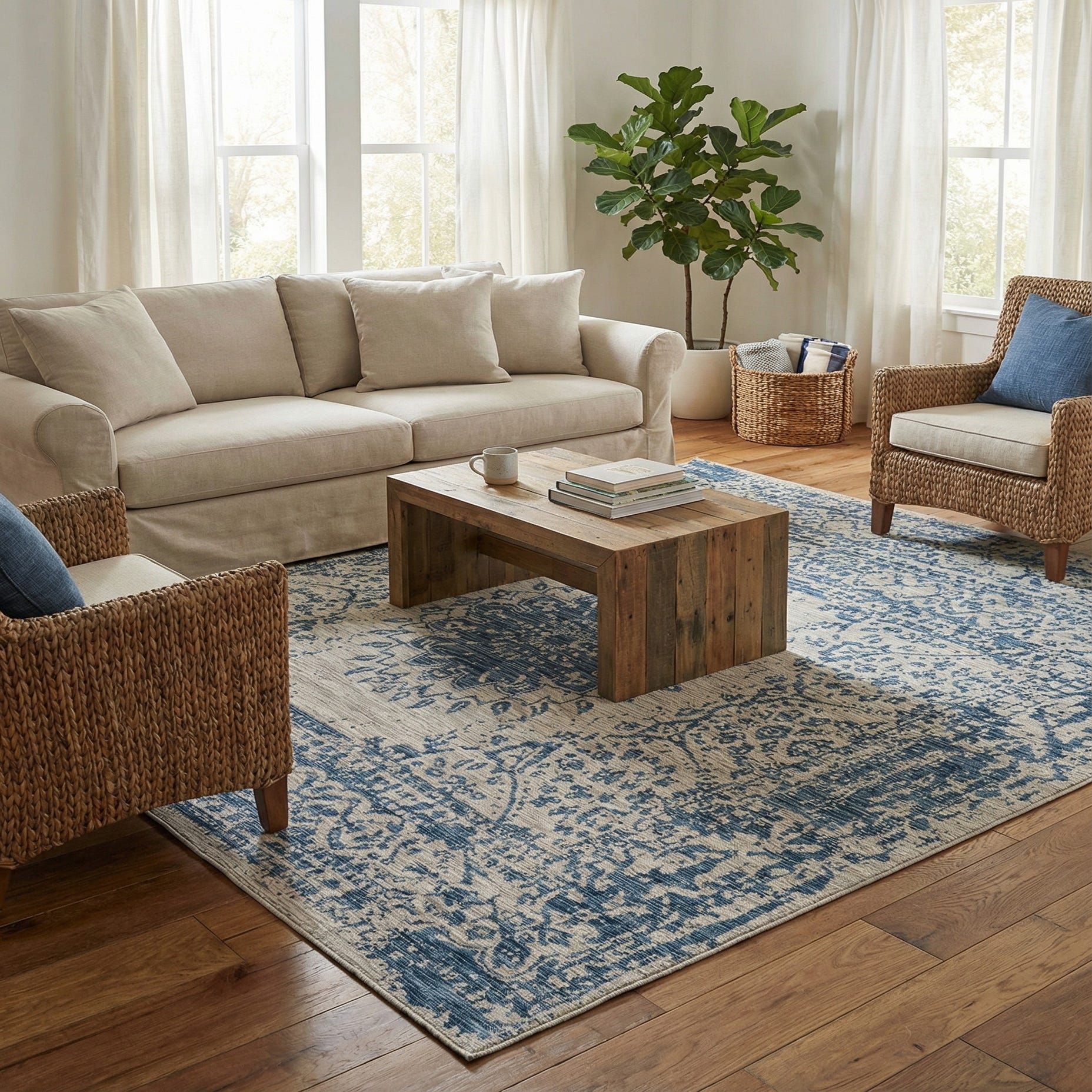 A traditional medallion and ornate border are rendered in a distressed, vintage-inspired pattern in tonal variations of blue. The design has a lived-in look with irregular edges and faded detailing that give the rug an authentic, old-world character while keeping the overall appearance calm and collected. The blue background anchors the pattern, letting the medallion and scrolling motifs read clearly from across the room.