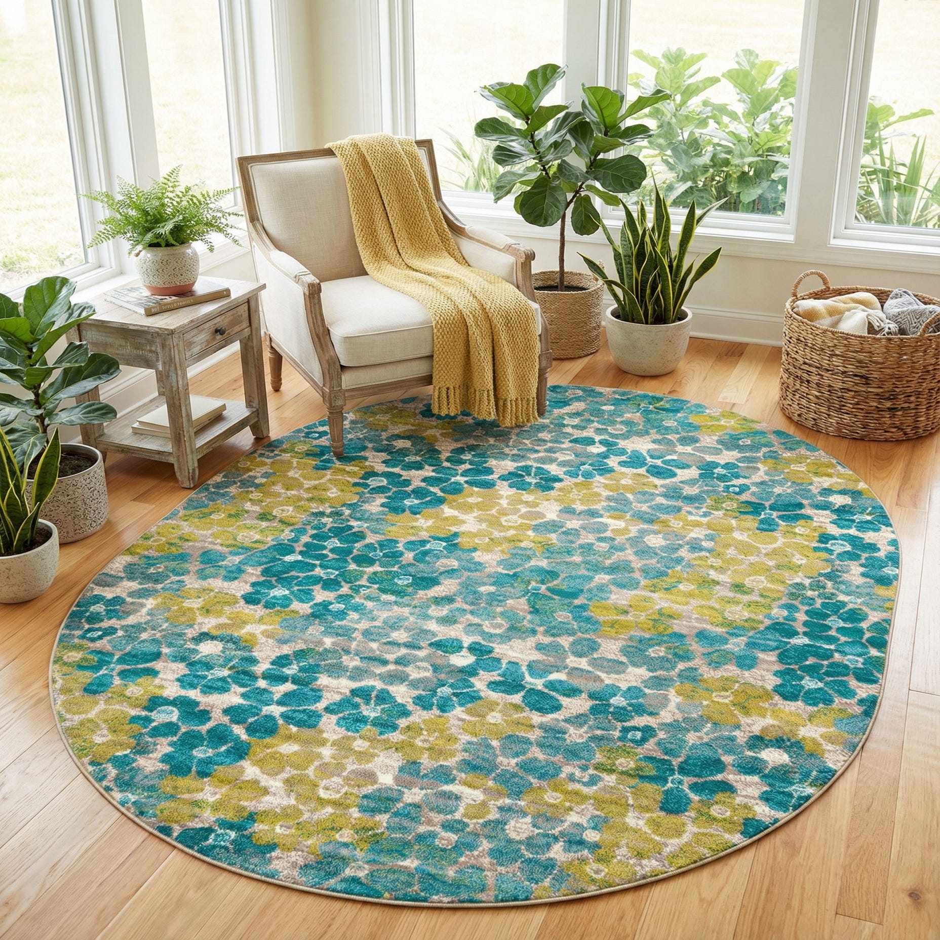 An oval Azalea rug from Rugs.com, featuring a modern botanical pattern of teal, blue, and yellow flowers on a light background.