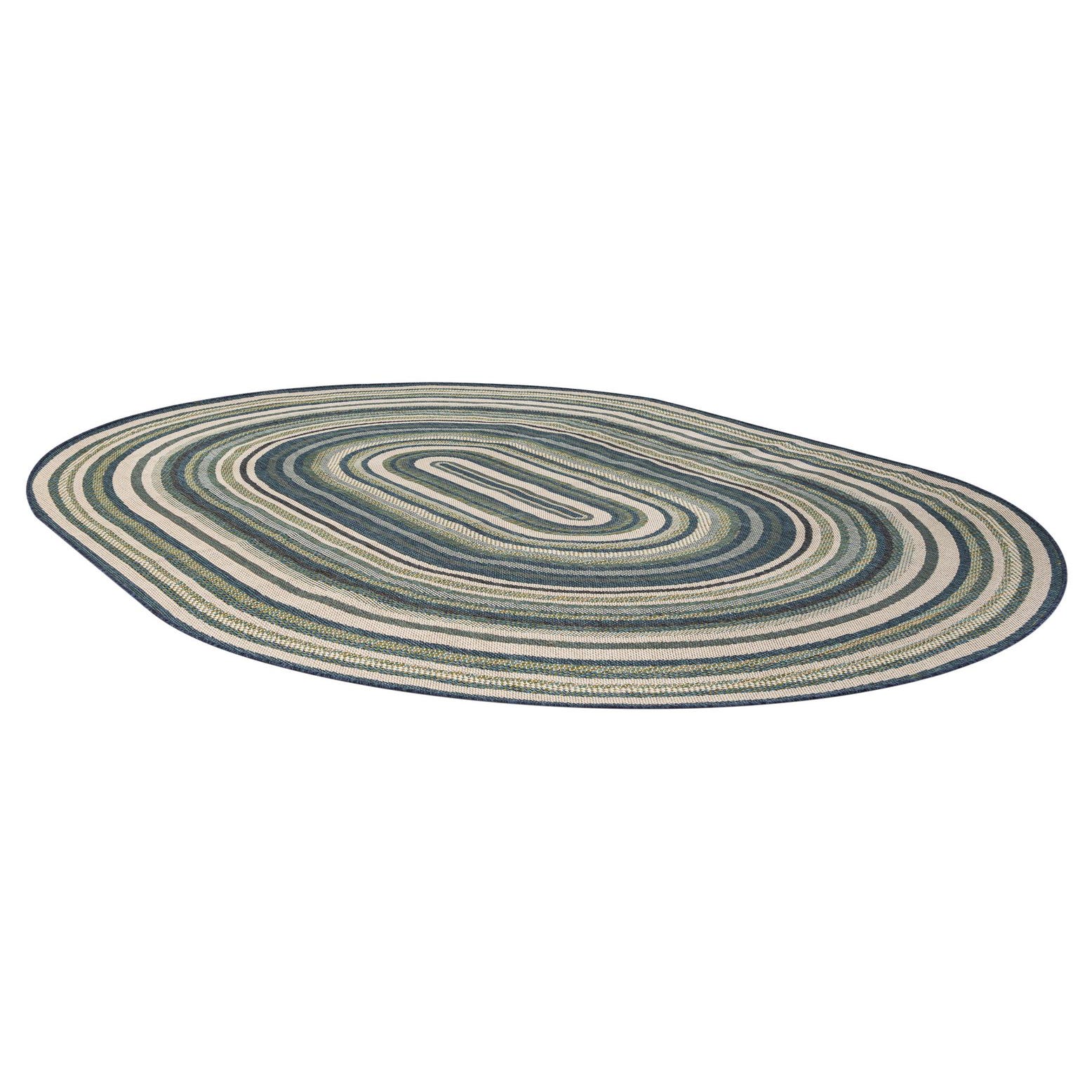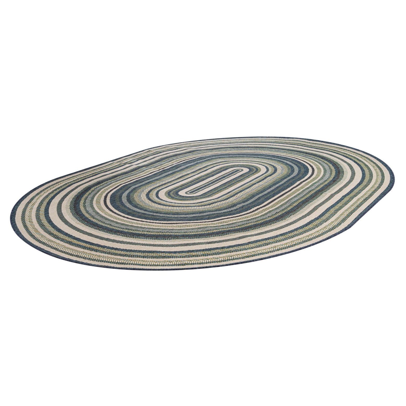 An oval Baja Outdoor rug featuring concentric stripes in varying shades of blue, teal, and beige, perfect for a patio.