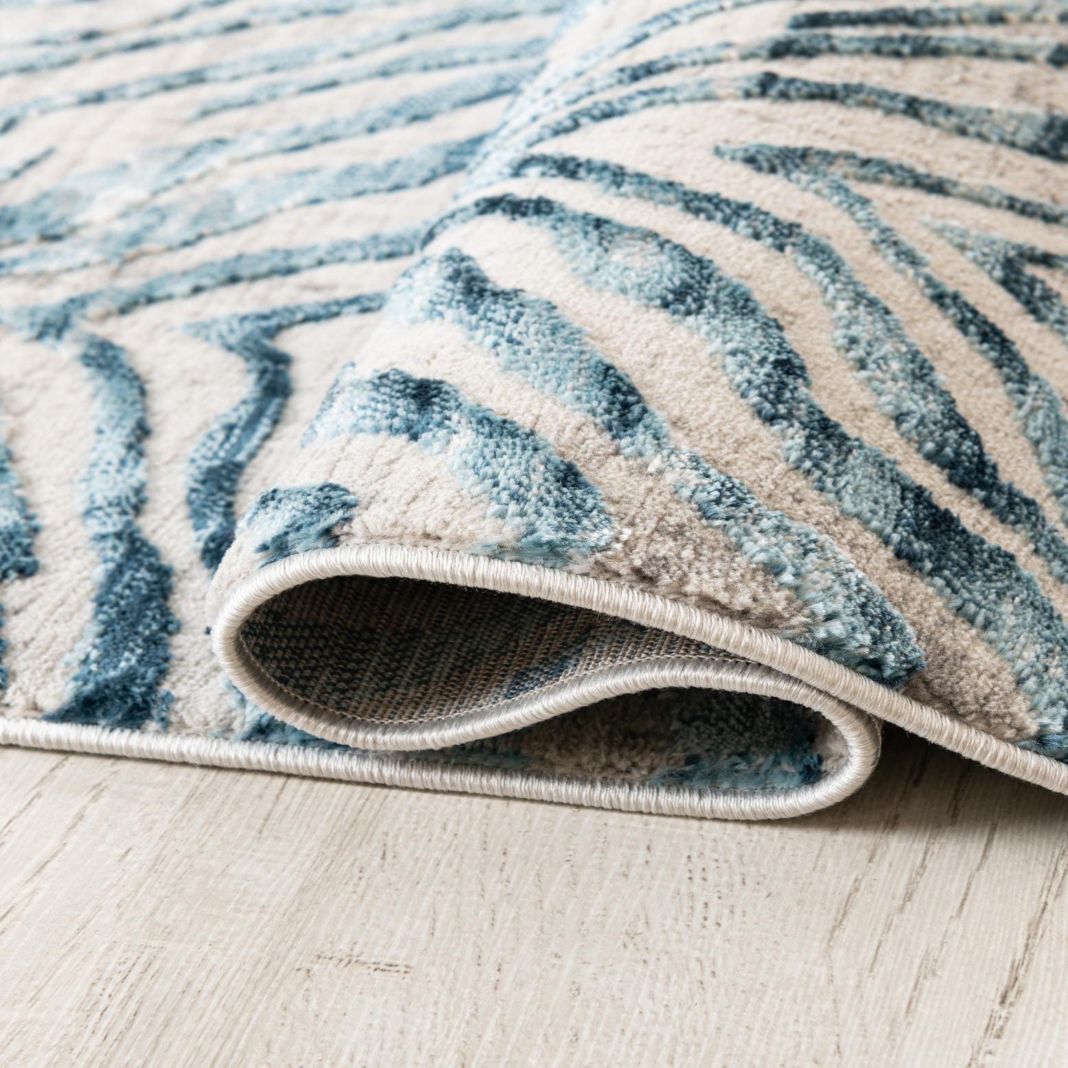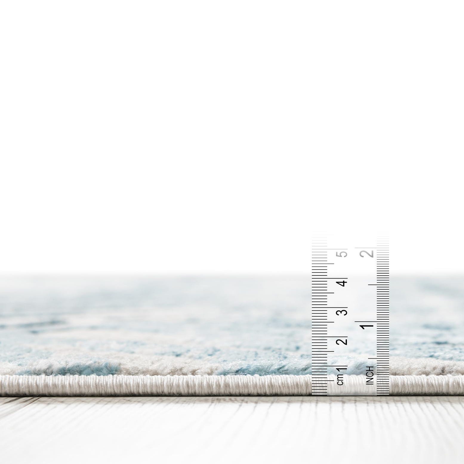 Primary color is Blue. Colors in this rug include: Blue, Ivory, Gray.