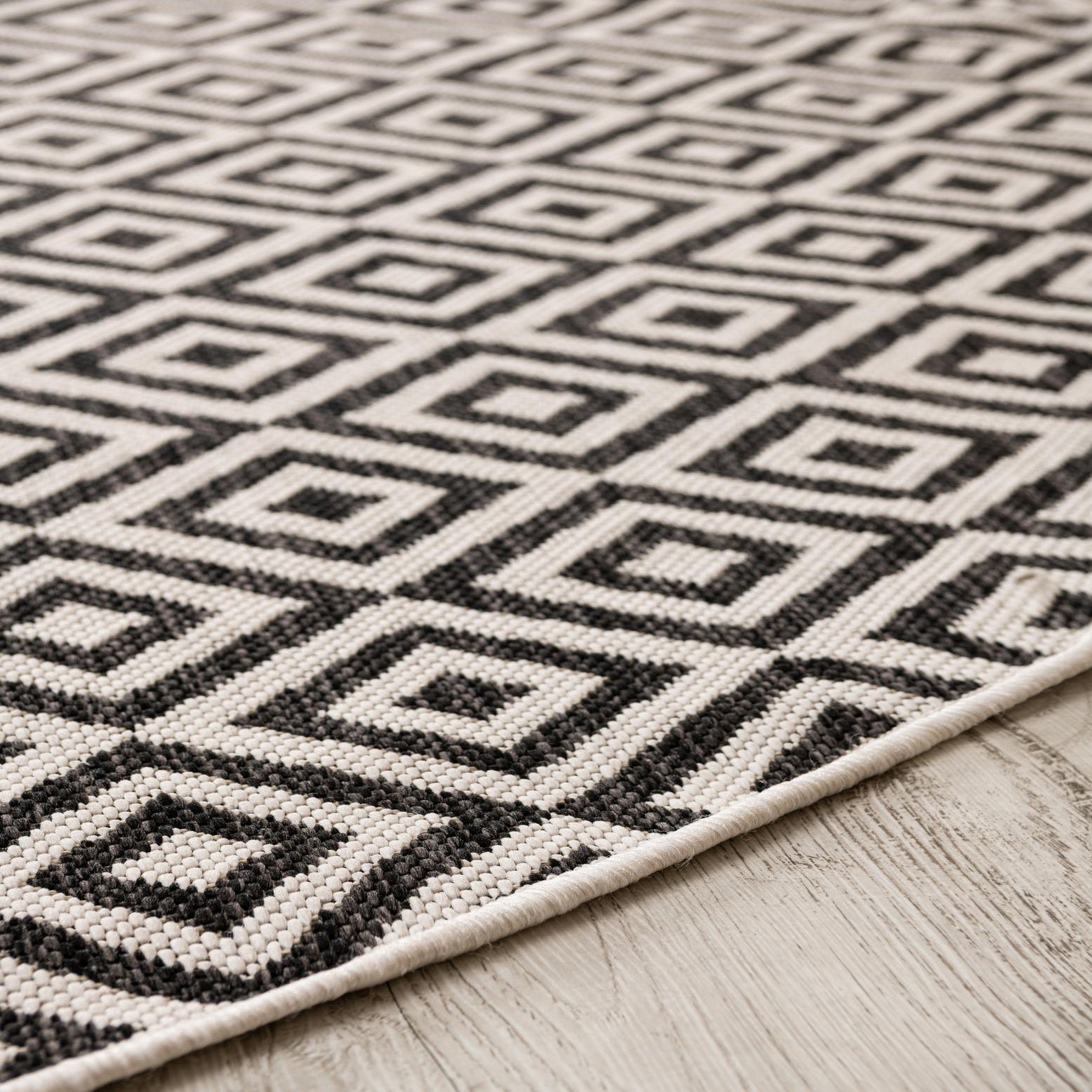 This rug is an ideal selection for patios, decks, and other exterior spaces looking for a touch of elegance without sacrificing practicality. Its design and color scheme can complement outdoor furniture in natural wood tones, metallic finishes, or even bolder, brightly colored accents. The robust material and eye-catching design make it a valuable addition to any outdoor setting seeking a balance of style and functionality.