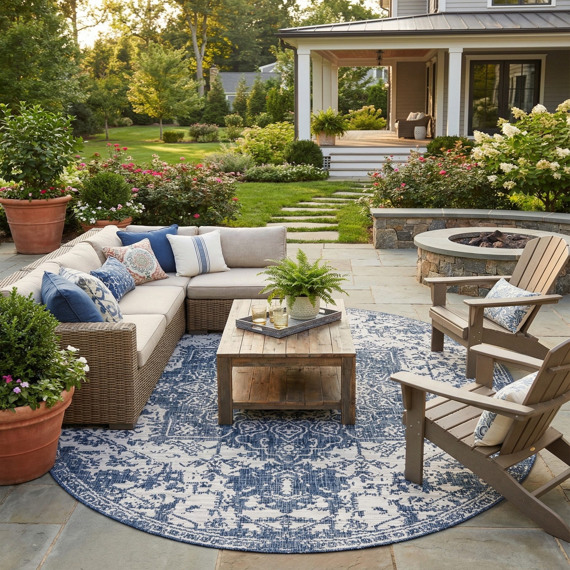 The oval shape and calming blue-and-ivory palette make this piece ideal beneath a round dining table on a covered patio, anchored under a bistro set, or placed in a sunroom to bring a finished look to casual seating. Pair it with natural wood or white wicker furniture, navy cushions, and woven accessories for a coastal or transitional scheme, or layer it with neutral linens and matte metal accents for a relaxed farmhouse vibe. The construction is well suited to outdoor living areas and indoor rooms that benefit from a durable, easygoing foundation.