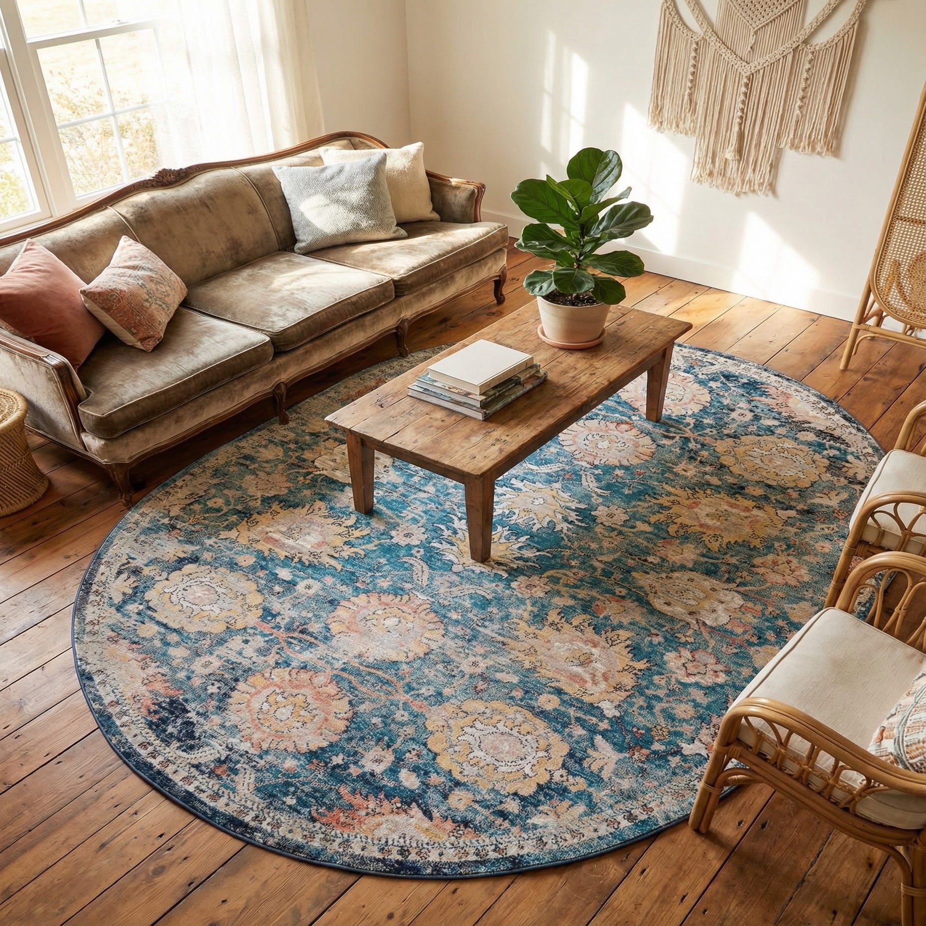 The oval silhouette makes this rug a natural anchor for an intimate dining nook or a cozy seating arrangement, and it layers well under a round table or in a foyer to soften hard lines. Pair it with navy or neutral upholstery, warm wood tones, and brass or aged-metal accents for a transitional look; it also complements coastal palettes and traditional interiors where floral motifs and softened colors are welcome. The mix of Blue, Ivory, Light Blue, and Rust Red offers both cool and warm notes, so it coordinates easily with a range of décor styles.