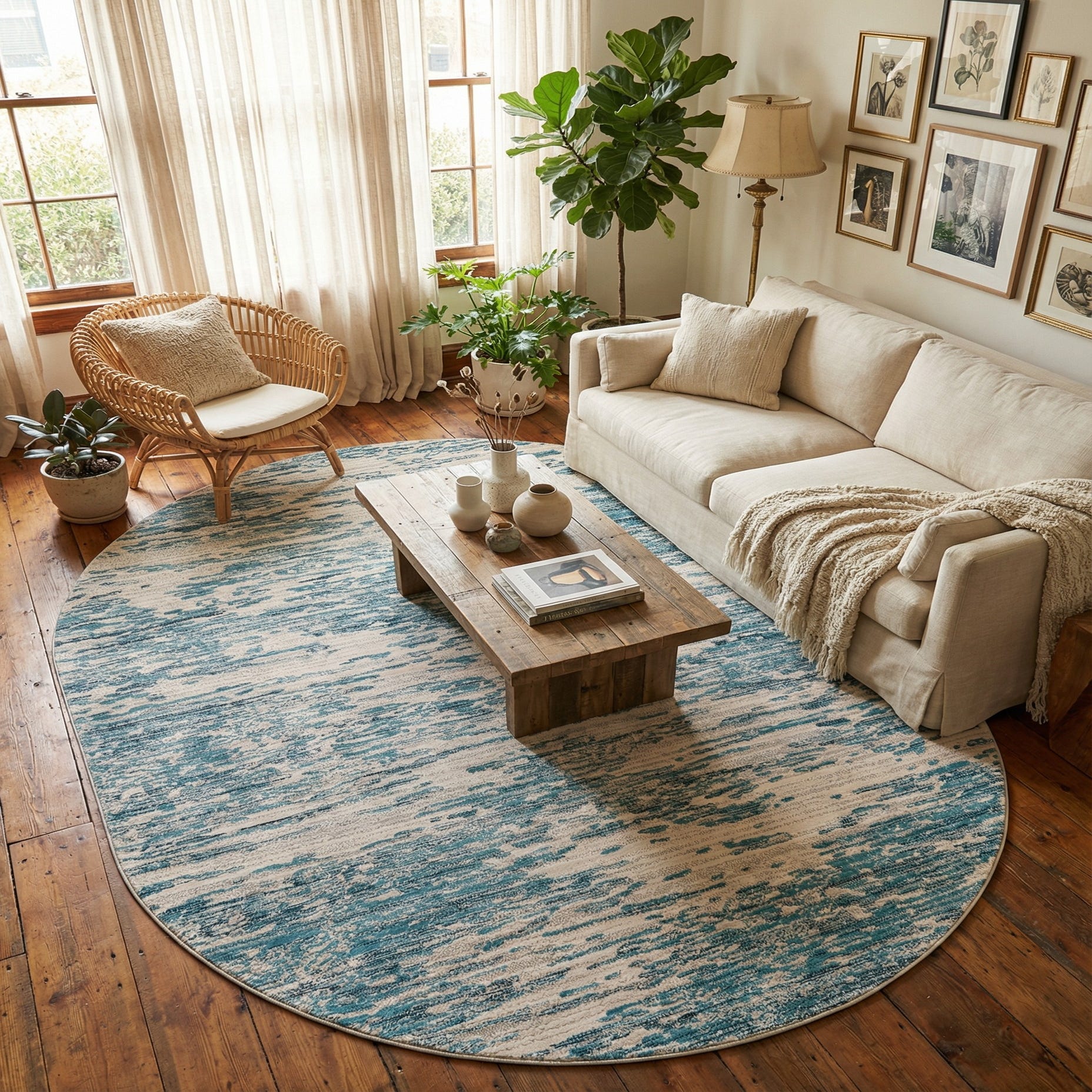 A painterly, abstract pattern of horizontal striations gives this oval rug a relaxed, contemporary look. The background is blue, layered with navy blue streaks, soft ivory highlights, gray undertones and warm beige accents that create a subtle, lived-in effect. The overall style leans coastal-modern, making it a natural fit for rooms that favor breezy textures and clean lines.